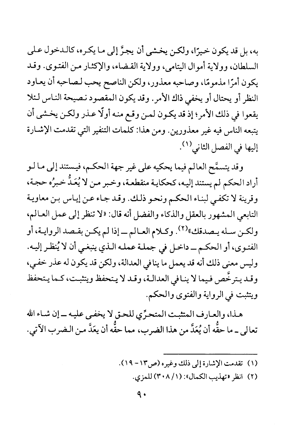 وقد يتسمَّح العالم فيما يحكيه على غير جهة الحكم، فيستند إلى ما لو أراد الحكم لم يستند إليه، كحكاية منقطعة، وخبر من لا يُعَدُّ خبرُه حجة، وقرينة لا تكفي لبناء الحكم ونحو ذلك. وقد جاء عن إياس بن معاوية التابعي المشهور بالعقل والذكاء والفضل أنه قال: "لا تنظر إلى عمل العالم، ولكن سله يصدقك" (¬٢). وكلام العالم ــ إذا لم يكن بقصد الرواية، أو الفتوى، أو الحكم ــ داخل في جملة عمله الذي ينبغي أن لا يُنظر إليه. وليس معنى ذلك أنه قد يعمل ما ينافي العدالة، ولكن قد يكون له عذر خفي، وقد يترخَّص فيما لا ينافي العدالة، وقد لا يتحفظ ويتثبت، كما يتحفظ ويتثبت في الرواية والفتوى والحكم.