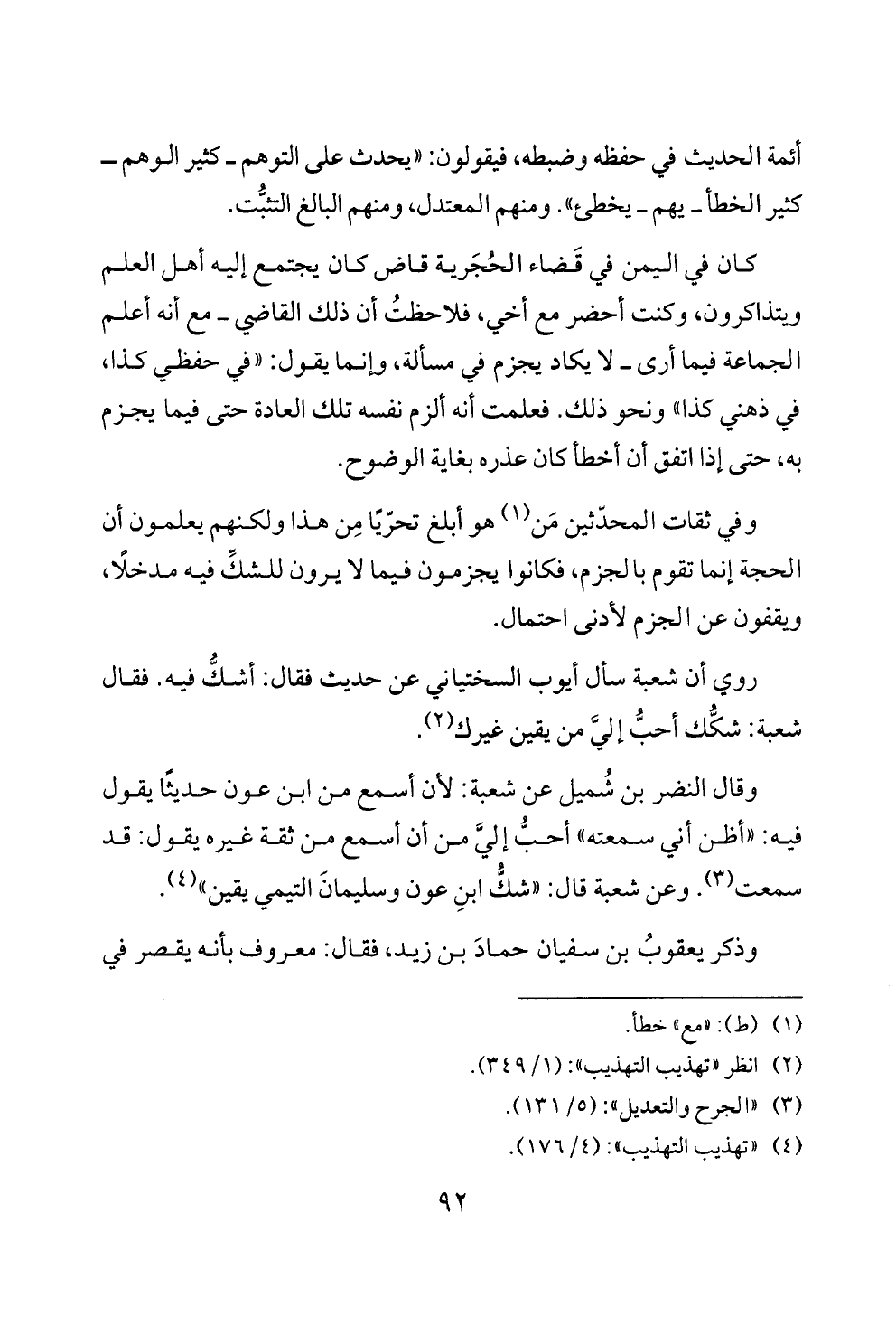 وفي ثقات المحدّثين مَن (¬١) هو أبلغ تحرّيًا مِن هذا ولكنهم يعلمون أن الحجة إنما تقوم بالجزم، فكانوا يجزمون فيما لا يرون للشكِّ فيه مدخلًا، ويقفون عن الجزم لأدنى احتمال.