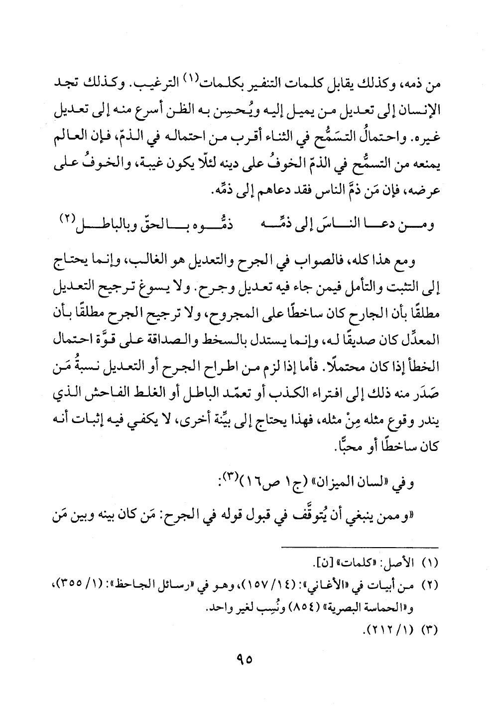 من ذمه، وكذلك يقابل كلمات التنفير بكلمات (¬١) الترغيب. وكذلك تجد الإنسان إلى تعديل من يميل إليه ويُحسِن به الظن أسرع منه إلى تعديل غيره. واحتمالُ التسَمُّح في الثناء أقرب من احتماله في الذمّ، فإن العالم يمنعه من التسمُّح في الذمّ الخوفُ على دينه لئلّا يكون غيبة، والخوفُ على عرضه، فإن مَن ذمَّ الناس فقد دعاهم إلى ذمِّه.