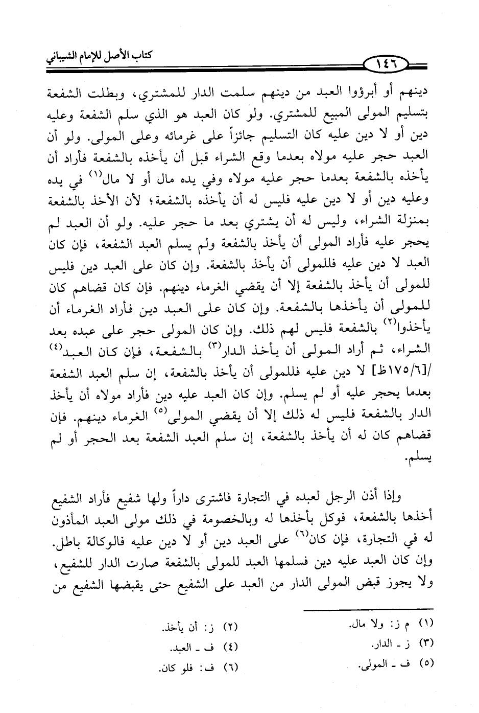 دينهم أو أبرؤوا العبد من دينهم سلمت الدار للمشتري، وبطلت الشفعة بتسليم المولى المبيع للمشتري. ولو كان العبد هو الذي سلم الشفعة وعليه دين أو لا دين عليه كان التسليم جائزاً على غرمائه وعلى المولى. ولو أن العبد حجر عليه مولاه بعدما وقع الشراء قبل أن يأخذه بالشفعة فأراد أن يأخذه بالشفعة بعدما حجر عليه مولاه وفي يده مال أو لا مال (¬1) في يده وعليه دين أو لا دين عليه فليس له أن يأخذه بالشفعة؛ لأن الأخذ بالشفعة بمنزلة الشراء، وليس له أن يشتري بعد ما حجر عليه. ولو أن العبد لم يحجر عليه فأراد المولى أن يأخذ بالشفعة ولم يسلم العبد الشفعة، فإن كان العبد لا دين عليه فللمولى أن يأخذ بالشفعة. وإن كان على العبد دين فليس للمولى أن يأخذ بالشفعة إلا أن يقضي الغرماء دينهم. فإن كان قضاهم كان للمولى أن يأخذها بالشفعة. وإن كان على العبد دين فأراد الغرماء أن يأخذوا (¬2) بالشفعة فليس لهم ذلك. وإن كان المولى حجر على عبده بعد الشراء، ثم أراد المولى أن يأخذ الدار (¬3) بالشفعة، فإن كان العبد (¬4) لا دين عليه فللمولى أن يأخذ بالشفعة، إن سلم العبد الشفعة بعدما يحجر عليه أو لم يسلم. وإن كان العبد عليه دين فأراد مولاه أن يأخذ الدار بالشفعة فليس له ذلك إلا أن يقضي المولى (¬5) الغرماء دينهم. فإن قضاهم كان له أن يأخذ بالشفعة، إن سلم العبد الشفعة بعد الحجر أو لم يسلم.