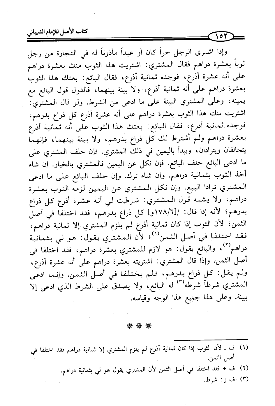 وإذا اشترى الرجل حراً كان أو عبداً مأذوناً له في التجارة من رجل ثوباً بعشرة دراهم فقال المشتري: اشتريت هذا الثوب منك بعشرة دراهم على أنه عشرة أذرع، فوجده ثمانية أذرع، فقال البائع: بعتك هذا الثوب بعشرة دراهم على أنه ثمانية أذرع، ولا بينة بينهما، فالقول قول البائع مع يمينه، وعلى المشتري البينة على ما ادعى من الشرط. ولو قال المشتري: اشتريت منك هذا الثوب بعشرة دراهم على أنه عشرة أذرع كل ذراع بدرهم، فوجده ثمانية أذرع، فقال البائع: بعتك هذا الثوب على أنه ثمانية أذرع بعشرة دراهم ولم أشترط لك كل ذراع بدرهم، ولا بينة بينهما، فإنهما يتحالفان ويترادان، ويبدأ باليمين في ذلك المشتري. فإن حلف المشتري على ما ادعى البائع حلف البائع. فإن نكل عن اليمين فالمشتري بالخيار. إن شاء أخذ الثوب بثمانية دراهم. وإن شاء ترك. وإن حلف البائع على ما ادعى المشتري ترادا البيع. وإن نكل المشتري عن اليمين لزمه الثوب بعشرة دراهم، ولا يشبه قول المشتري: شرطت في أنه عشرة أذرع كل ذراع بدرهم؛ لأنه إذا قال: كل ذراع بدرهم، فقد اختلفا في أصل الثمن؛ لأن الثوب إذا كان ثمانية أذرع لم يلزم المشتري إلا ثمانية دراهم، فقد اختلفا في أصل الثمن (¬1)؛ لأن المشتري يقول: هو لي بثمانية دراهم (¬2)، والبائع يقول: هو لازم للمشتري بعشرة دراهم، فقد اختلفا في أصل الثمن. وإذا قال المشتري: اشتريته بعشرة دراهم على أنه عشرة أذرع، ولم يقل: كل ذراع بدرهم، فلم يختلفا في أصل الثمن. وإنما ادعى المشتري شرطاً شرطه (¬3) له البائع، ولا يصدق على الشرط الذي ادعى إلا ببينة. وعلى هذا جميع هذا الوجه وقياسه.