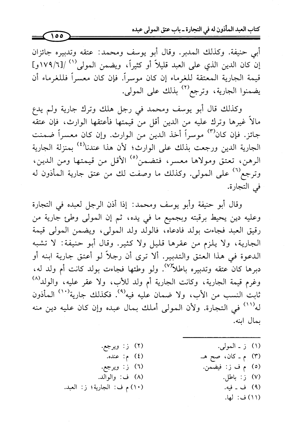 وقال أبو حنيفة وأبو يوسف ومحمد: إذا أذن الرجل لعبده في التجارة وعليه دين يحيط برقبته وبجميع ما في يده، ثم إن المولى وطئ جارية من رقيق العبد فجاءت بولد فادعاه، فالولد ولد المولى، ويضمن المولى قيمة الجارية، ولا يلزم من عقرها قليل ولا كثير. وقال أبو حنيفة: لا تشبه الدعوة في هذا العتق والتدبير. ألا ترى أن رجلاً لو أعتق جارية ابنه أو دبرها كان عتقه وتدبيره باطلاً (¬7). ولو وطئها فجاءت بولد كانت أم ولد له، وغرم قيمة الجارية، وكانت الجارية أم ولد للأب، ولا عقر عليه، والولد (¬8) ثابت النسب من الأب، ولا ضمان عليه فيه (¬9). فكذلك جارية (¬10) المأذون له (¬11) في التجارة. ولأن المولى أملك بمال عبده وإن كان عليه دين منه بمال ابنه.