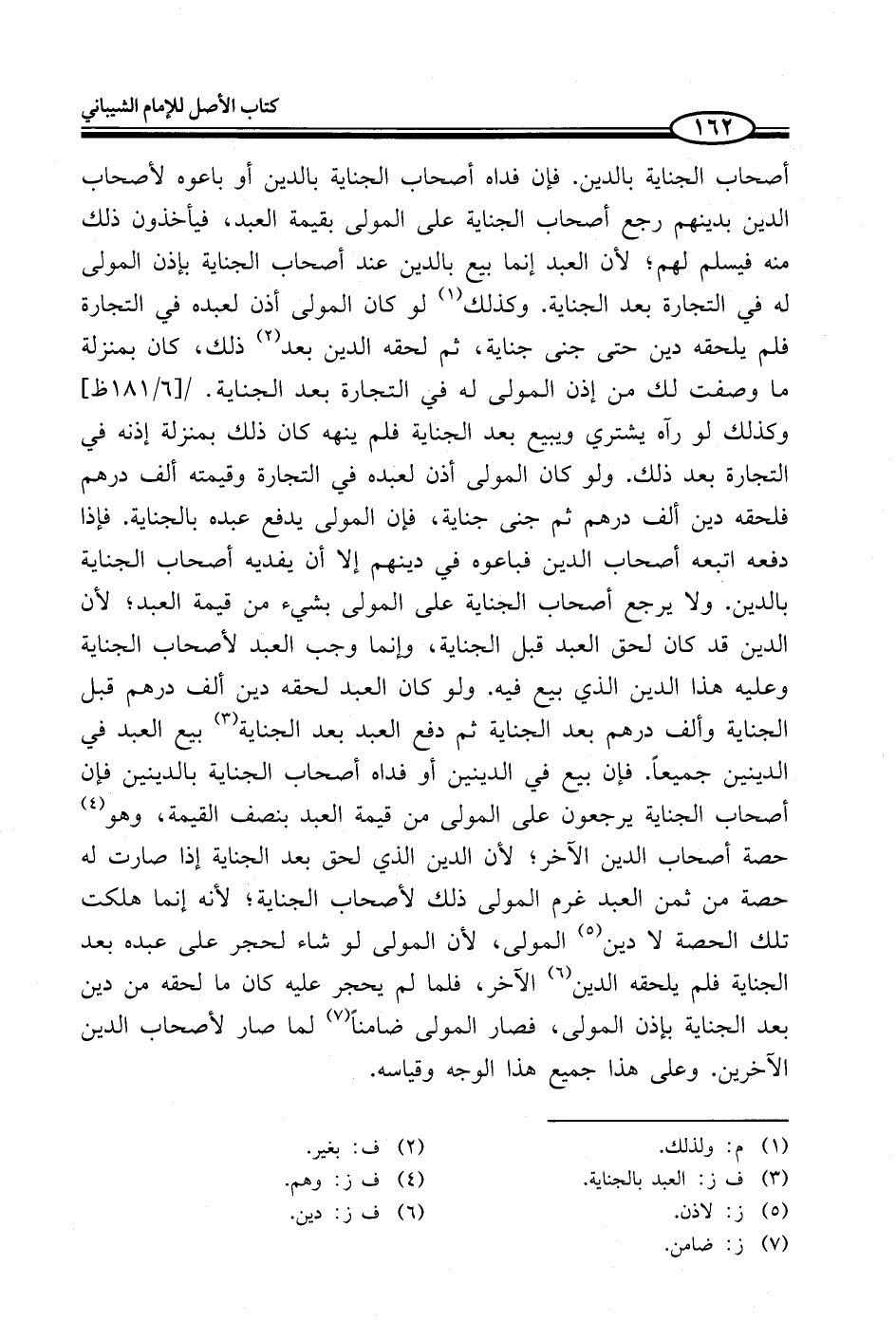 أصحاب الجناية بالدين. فإن فداه أصحاب الجناية بالدين أو باعوه لأصحاب الدين بدينهم رجع أصحاب الجناية على المولى بقيمة العبد، فيأخذون ذلك منه فيسلم لهم؛ لأن العبد إنما بيع بالدين عند أصحاب الجناية بإذن المولى له في التجارة بعد الجناية. وكذلك (¬1) لو كان المولى أذن لعبده في التجارة فلم يلحقه دين حتى جنى جناية، ثم لحقه الدين بعد (¬2) ذلك، كان بمنزلة ما وصفت لك من إذن المولى له في التجارة بعد الجناية. وكذلك لو رآه يشتري ويبيع بعد الجناية فلم ينهه كان ذلك بمنزلة إذنه في التجارة بعد ذلك. ولو كان المولى أذن لعبده في التجارة وقيمته ألف درهم فلحقه دين ألف درهم ثم جنى جناية، فإن المولى يدفع عبده بالجناية. فإذا دفعه اتبعه أصحاب الدين فباعوه في دينهم إلا أن يفديه أصحاب الجناية بالدين. ولا يرجع أصحاب الجناية على المولى بشيء من قيمة العبد؛ لأن الدين قد كان لحق العبد قبل الجناية، وإنما وجب العبد لأصحاب الجناية وعليه هذا الدين الذي بيع فيه. ولو كان العبد لحقه دين ألف درهم قبل الجناية وألف درهم بعد الجناية ثم دفع العبد بعد الجناية (¬3) بيع العبد في الدينين جميعاً. فإن بيع في الدينين أو فداه أصحاب الجناية بالدينين فإن أصحاب الجناية يرجعون على المولى من قيمة العبد بنصف القيمة، وهو (¬4) حصة أصحاب الدين الآخر؛ لأن الدين الذي لحق بعد الجناية إذا صارت له حصة من ثمن العبد غرم المولى ذلك لأصحاب الجناية؛ لأنه إنما هلكت تلك الحصة لا دين (¬5) المولى، لأن المولى لو شاء لحجر على عبده بعد الجناية فلم يلحقه الدين (¬6) الآخر، فلما لم يحجر عليه كان ما لحقه من دين بعد الجناية بإذن المولى، فصار المولى ضامناً (¬7) لما صار لأصحاب الدين الآخرين. وعلى هذا جميع هذا الوجه وقياسه.