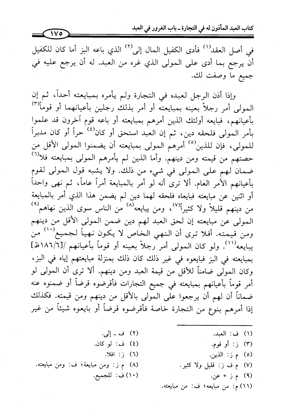 وإذا أذن الرجل لعبده في التجارة ولم يأمره بمبايعته أحداً، ثم إن المولى أمر رجلاً بعينه بمبايعته أو أمر بذلك رجلين بأعيانهما أو قوماً (¬3) بأعيانهم، فبايعه أولئك الذين أمرهم بمبايعته أو باعه قوم آخرون قد علموا بأمر المولى فلحقه دين، ثم إن العبد استحق أو كان (¬4) حراً أو كان مدبراً للمولى، فإن للذين (¬5) أمرهم المولى بمبايعته أن يضمنوا المولى الأقل من حصتهم من قيمته ومن دينهم. وأما الذين لم يأمرهم المولى بمبايعته فلا (¬6) ضمان لهم على المولى في شيء من ذلك. ولا يشبه قول المولى لقوم بأعيانهم الأمر العام. ألا ترى أنه لو أمر بالمبايعة أمراً عاماً، ثم نهى واحداً أو اثنين عن مبايعته فبايعاه فلحقه لهما دين لم يضمن هذا الذي أمر بالمبايعة من دينهم قليلاً ولا كثيراً (¬7)، ومن يبايعه (¬8) من الناس سوى الذين نهاهم (¬9) المولى عن مبايعته إن لحق العبد لهم دين ضمن المولى الأقل من دينهم ومن قيمته. أفلا ترى أن النهي الخاص لا يكون نهياً لجميع (¬10) من يبايعه (¬11). ولو كان المولى أمر رجلاً بعينه أو قوماً بأعيانهم بمبايعته في البز فبايعوه في غير ذلك كان ذلك بمنزلة مبايعتهم إياه في البز، وكان المولى ضامناً للأقل من قيمة العبد ومن دينهم. ألا ترى أن المولى لو أمر قوماً بأعيانهم بمبايعته في جميع التجارات فأقرضوه قرضًا أو ضمنوه عنه ضمانًا أن لهم أن يرجعوا على المولى بالأقل من دينهم ومن قيمته. فكذلك إذا أمرهم بنوع من التجارة خاصة فأقرضوه قرضاً أو بايعوه شيئاً من غير