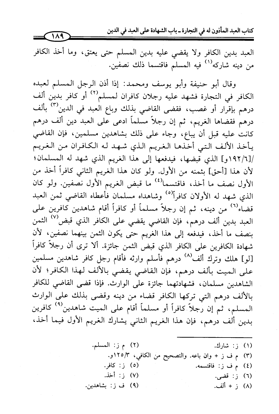 وقال أبو حنيفة وأبو يوسف ومحمد: إذا أذن الرجل المسلم لعبده الكافر في التجارة فشهد عليه رجلان كافران لمسلم (¬2) أو كافر بدين ألف درهم بإقرار أو غصب، فقضى القاضي بذلك وباع العبد في الدين (¬3) بألف درهم فقضاها الغريم، ثم إن رجلاً مسلماً ادعى على العبد دين ألف درهم كانت عليه قبل أن يباع، وجاء على ذلك بشاهدين مسلمين، فإن القاضي يأخذ الألف التي أخذها الغريم الذي شهد له الكافران من الغريم الذي قبضها، فيدفعها إلى هذا الغريم الذي شهد له المسلمان؛ لأن هذا [أحق] بثمنه من الأول. ولو كان هذا الغريم الثاني كافراً أخذ من الأول نصف ما أخذ، فاقتسما (¬4) ما قبض الغريم الأول نصفين. ولو كان الذي شهد له الأولان كافراً (¬5) وشاهداه مسلمان فأعطاه القاضي ثمن العبد قضاء (¬6) من دينه، ثم إن رجلاً مسلماً أو كافراً أقام شاهدين كافرين على العبد بدين ألف درهم، فإن القاضي يقضي على الكافر الذي قبض (¬7) الثمن بنصف ما أخذ، فيدفعه إلى هذا الغريم حتى يكون الثمن بينهما نصفين، لأن شهادة الكافرين على الكافر الذي قبض الثمن جائزة. ألا ترى أن رجلاً كافراً [لو] هلك وترك ألف (¬8) درهم فأسلم وارثه فأقام رجل كافر شاهدين مسلمين على الميت بألف درهم، فإن القاضي يقضي بالألف لهذا الكافر؛ لأن الشاهدين مسلمان، فشهادتهما جائزة على الوارث. فإذا قضى القاضي للكافر بالألف درهم التي تركها الكافر قضاء من دينه وقضى بذلك على الوارث المسلم، ثم إن رجلاً. كافراً أو مسلماً أقام على الميت شاهدين (¬9) كافرين بدين ألف درهم، فإن هذا الغريم الثاني يشارك الغريم الأول فيما أخذ،