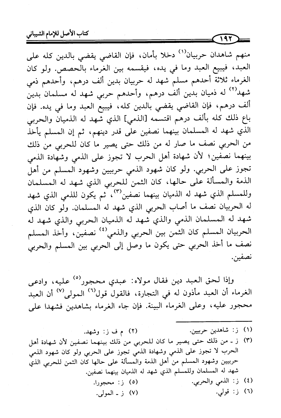 منهم شاهدان حربيان (¬1) دخلا بأمان، فإن القاضي يقضي بالدين كله على العبد، فيبيع العبد وما في يده، فيقسمه بين الغرماء بالحصص. ولو كان الغرماء ثلاثة أحدهم مسلم شهد له حربيان بدين ألف درهم، وأحدهم ذمي شهد (¬2) له ذميان بدين ألف درهم، وأحدهم حربي شهد له مسلمان بدين ألف درهم، فإن القاضي يقضي بالدين كله، فيبيع العبد وما في يده. فإن باع ذلك كله بألف درهم اقتسمه [الذمي] الذي شهد له الذميان والحربي الذي شهد له المسلمان بينهما نصفين على قدر دينهم، ثم إن المسلم يأخذ من الحربي نصف ما صار له من ذلك حتى يصير ما كان للحربي من ذلك بينهما نصفين؛ لأن شهادة أهل الحرب لا تجوز على الذمي وشهادة الذمي تجوز على الحربي. ولو كان شهود الذمي حربيين وشهود المسلم من أهل الذمة والمسألة على حالها، كان الثمن للحربي الذي شهد له المسلمان وللمسلم الذي شهد له الذميان بينهما نصفين (¬3)، ثم يكون للذمي الذي شهد له الحربيان نصف ما أصاب الحربي الذي شهد له المسلمان. ولو كان الذي شهد له المسلمان الذمي والذي شهد له الذميان الحربي والذي شهد له الحربيان المسلم كان الثمن بين الحربي والذمي (¬4) نصفين، وأخذ المسلم نصف ما أخذ الحربي حتى يكون ما وصل إلى الحربي بين المسلم والحربي نصفين.