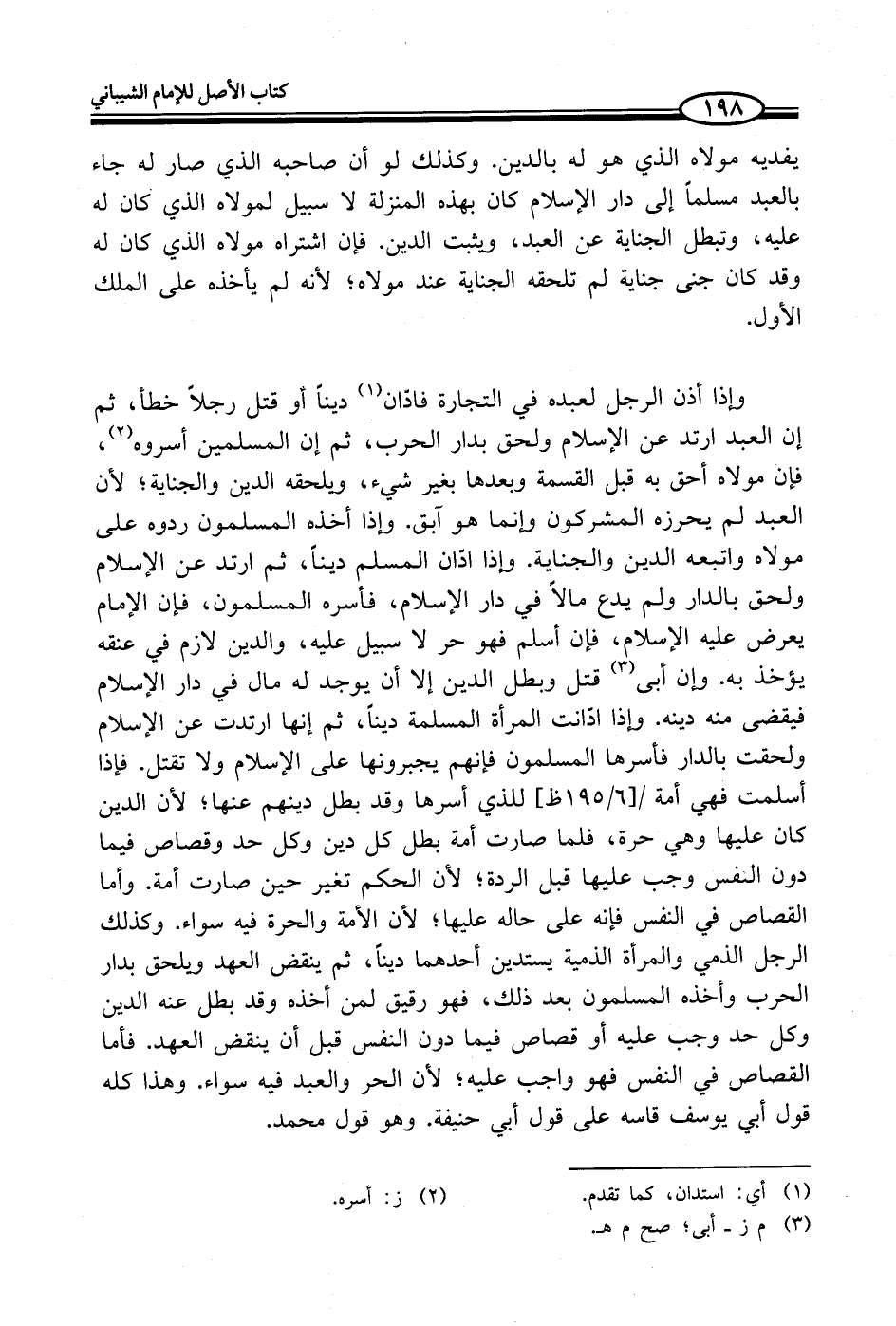 وإذا أذن الرجل لعبده في التجارة فادّان (¬1) ديناً أو قتل رجلاً خطأ، ثم إن العبد ارتد عن الإسلام ولحق بدار الحرب، ثم إن المسلمين أسروه (¬2)، فإن مولاه أحق به قبل القسمة وبعدها بغير شيء، ويلحقه الدين والجناية؛ لأن العبد لم يحرزه المشركون وإنما هو آبق. وإذا أخذه المسلمون ردوه على مولاه واتبعه الدين والجناية. وإذا ادّان المسلم ديناً، ثم ارتد عن الإسلام ولحق بالدار ولم يدع مالاً في دار الإسلام، فأسره المسلمون، فإن الإمام يعرض عليه الإسلام، فإن أسلم فهو حر لا سبيل عليه، والدين لازم في عنقه يؤخذ به. وإن أبى (¬3) قتل وبطل الدين إلا أن يوجد له مال في دار الإسلام فيقضى منه دينه. وإذا ادّانت المرأة المسلمة ديناً، ثم إنها ارتدت عن الإسلام ولحقت بالدار فأسرها المسلمون فإنهم يجبرونها على الإسلام ولا تقتل. فإذا أسلمت فهي أمة للذي أسرها وقد بطل دينهم عنها؛ لأن الدين كان عليها وهي حرة، فلما صارت أمة بطل كل دين وكل حد وقصاص فيما دون النفس وجب عليها قبل الردة؛ لأن الحكم تغير حين صارت أمة. وأما القصاص في النفس فإنه على حاله عليها؛ لأن الأمة والحرة فيه سواء. وكذلك الرجل الذمي والمرأة الذمية يستدين أحدهما ديناً، ثم ينقض العهد ويلحق بدار الحرب وأخذه المسلمون بعد ذلك، فهو رقيق لمن أخذه وقد بطل عنه الدين وكل حد وجب عليه أو قصاص فيما دون النفس قبل أن ينقض العهد. فأما القصاص في النفس فهو واجب عليه؛ لأن الحر والعبد فيه سواء. وهذا كله قول أبي يوسف قاسه على قول أبي حنيفة. وهو قول محمد.