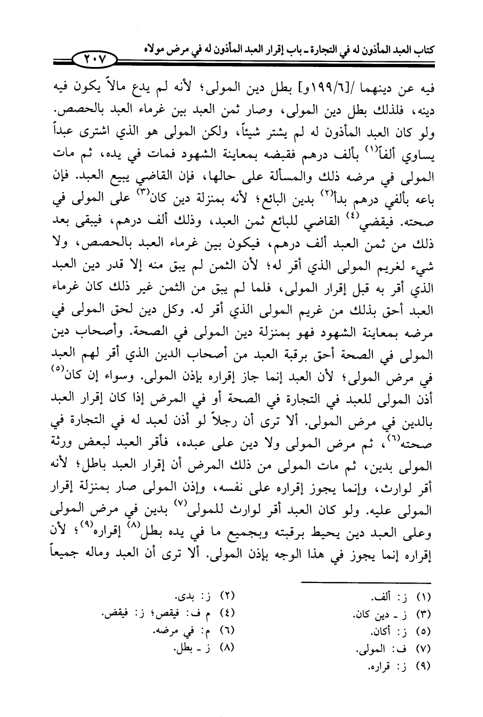 فيه عن دينهما بطل دين المولى؛ لأنه لم يدع مالاً يكون فيه دينه، فلذلك بطل دين المولى، وصار ثمن العبد بين غرماء العبد بالحصص. ولو كان العبد المأذون له لم يشتر شيئاً، ولكن المولى هو الذي اشترى عبداً يساوي ألفاً (¬1) بألف درهم فقبضه بمعاينة الشهود فمات في يده، ثم مات المولى في مرضه ذلك والمسألة على حالها، فإن القاضي يبيع العبد. فإن باعه بألفي درهم بدأ (¬2) بدين البائع؛ لأنه بمنزلة دين كان (¬3) على المولى في صحته. فيقضي (¬4) القاضي للبائع ثمن العبد، وذلك ألف درهم، فيبقى بعد ذلك من ثمن العبد ألف درهم، فيكون بين غرماء العبد بالحصص، ولا شيء لغريم المولى الذي أقر له؛ لأن الثمن لم يبق منه إلا قدر دين العبد الذي أقر به قبل إقرار المولى، فلما لم يبق من الثمن غير ذلك كان غرماء العبد أحق بذلك من غريم المولى الذي أقر له. وكل دين لحق المولى في مرضه بمعاينة الشهود فهو بمنزلة دين المولى في الصحة. وأصحاب دين المولى في الصحة أحق برقبة العبد من أصحاب الدين الذي أقر لهم العبد في مرض المولى؛ لأن العبد إنما جاز إقراره بإذن المولى. وسواء إن كان (¬5) أذن المولى للعبد في التجارة في الصحة أو في المرض إذا كان إقرار العبد بالدين في مرض المولى. ألا ترى أن رجلاً لو أذن لعبد له في التجارة في صحته (¬6)، ثم مرض المولى ولا دين على عبده، فأقر العبد لبعض ورثة المولى بدين، ثم مات المولى من ذلك المرض أن إقرار العبد باطل؛ لأنه أقر لوارث، وإنما يجوز إقراره على نفسه، وإذن المولى صار بمنزلة إقرار المولى عليه. ولو كان العبد أقر لوارث للمولى (¬7) بدين في مرض المولى وعلى العبد دين يحيط برقبته وبجميع ما في يده بطل (¬8) إقراره (¬9)؛ لأن إقراره إنما يجوز في هذا الوجه بإذن المولى. ألا ترى أن العبد وماله جميعاً
