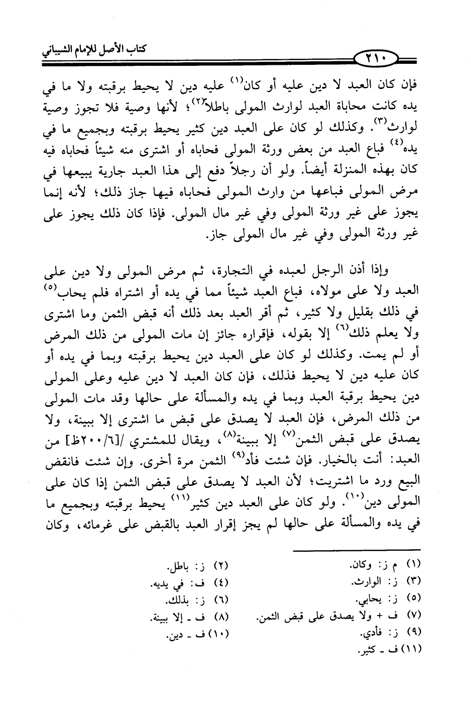 وإذا أذن الرجل لعبده في التجارة، ثم مرض المولى ولا دين على العبد ولا على مولاه، فباع العبد شيئاً مما في يده أو اشتراه فلم يحاب (¬5) في ذلك بقليل ولا كثير، ثم أقر العبد بعد ذلك أنه قبض الثمن وما اشترى ولا يعلم ذلك (¬6) إلا بقوله، فإقراره جائز إن مات المولى من ذلك المرض أو لم يمت. وكذلك لو كان على العبد دين يحيط برقبته وبما في يده أو كان عليه دين لا يحيط فذلك، فإن كان العبد لا دين عليه وعلى المولى دين يحيط برقبة العبد وبما في يده والمسألة على حالها وقد مات المولى من ذلك المرض، فإن العبد لا يصدق على قبض ما اشترى إلا ببينة، ولا يصدق على قبض الثمن (¬7) إلا ببينة (¬8)، ويقال للمشتري من العبد: أنت بالخيار. فإن شئت فأد (¬9) الثمن مرة أخرى. وإن شئت فانقض البيع ورد ما اشتريت؛ لأن العبد لا يصدق على قبض الثمن إذا كان على المولى دين (¬10). ولو كان على العبد دين كثير (¬11) يحيط برقبته وبجميع ما في يده والمسألة على حالها لم يجز إقرار العبد بالقبض على غرمائه، وكان