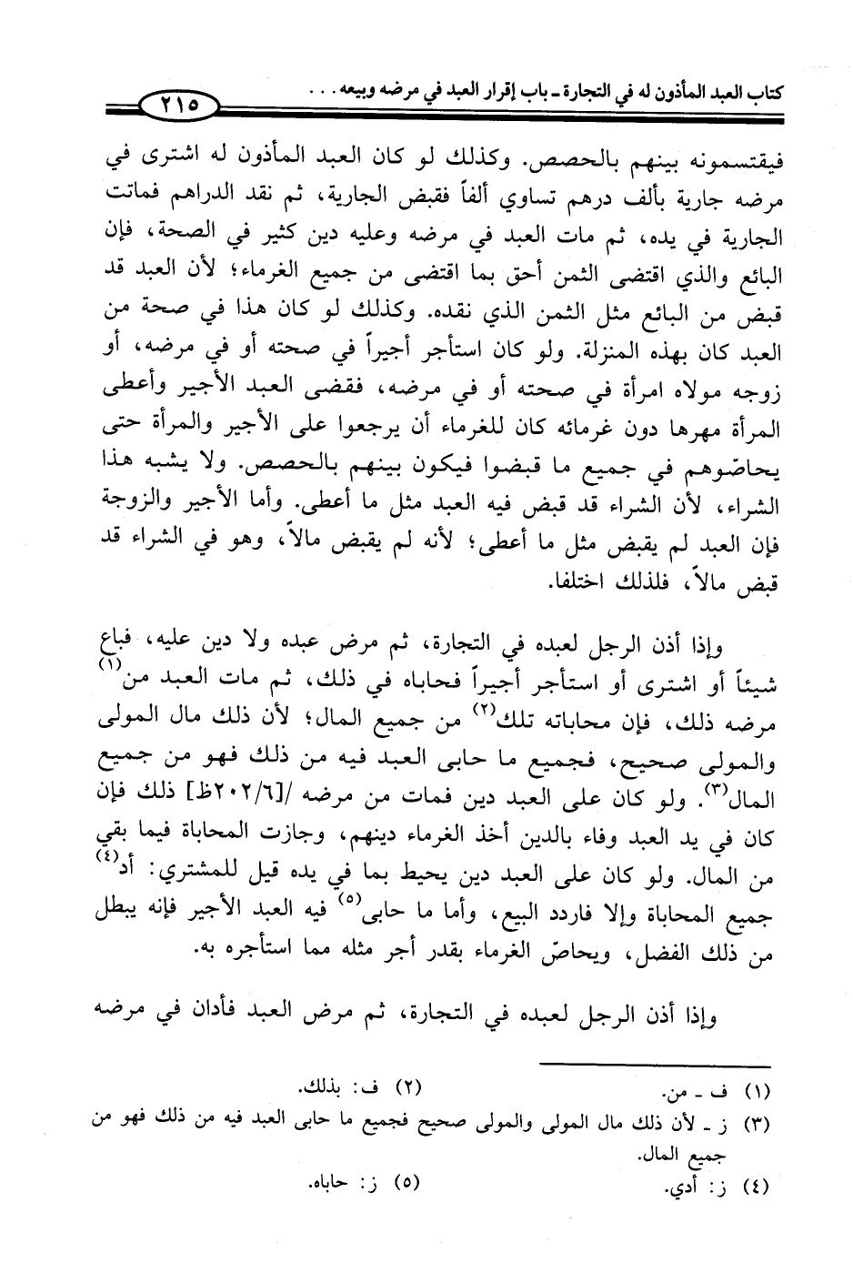فيقتسمونه بينهم بالحصص. وكذلك لو كان العبد المأذون له اشترى في مرضه جارية بألف درهم تساوي ألفاً فقبض الجارية، ثم نقد الدراهم فماتت الجارية في يده، ثم مات العبد في مرضه وعليه دين كثير في الصحة، فإن البائع والذي اقتضى الثمن أحق بما اقتضى من جميع الغرماء؛ لأن العبد قد قبض من البائع مثل الثمن الذي نقده. وكذلك لو كان هذا في صحة من العبد كان بهذه المنزلة. ولو كان استأجر أجيراً في صحته أو في مرضه، أو زوجه مولاه امرأة في صحته أو في مرضه، فقضى العبد الأجير وأعطى المرأة مهرها دون غرمائه كان للغرماء أن يرجعوا على الأجير والمرأة حتى يحاصّوهم في جميع ما قبضوا فيكون بينهم بالحصص. ولا يشبه هذا الشراء، لأن الشراء قد قبض فيه العبد مثل ما أعطى. وأما الأجير والزوجة فإن العبد لم يقبض مثل ما أعطى، لأنه لم يقبض مالاً، وهو في الشراء قد قبض مالاً، فلذلك اختلفا.