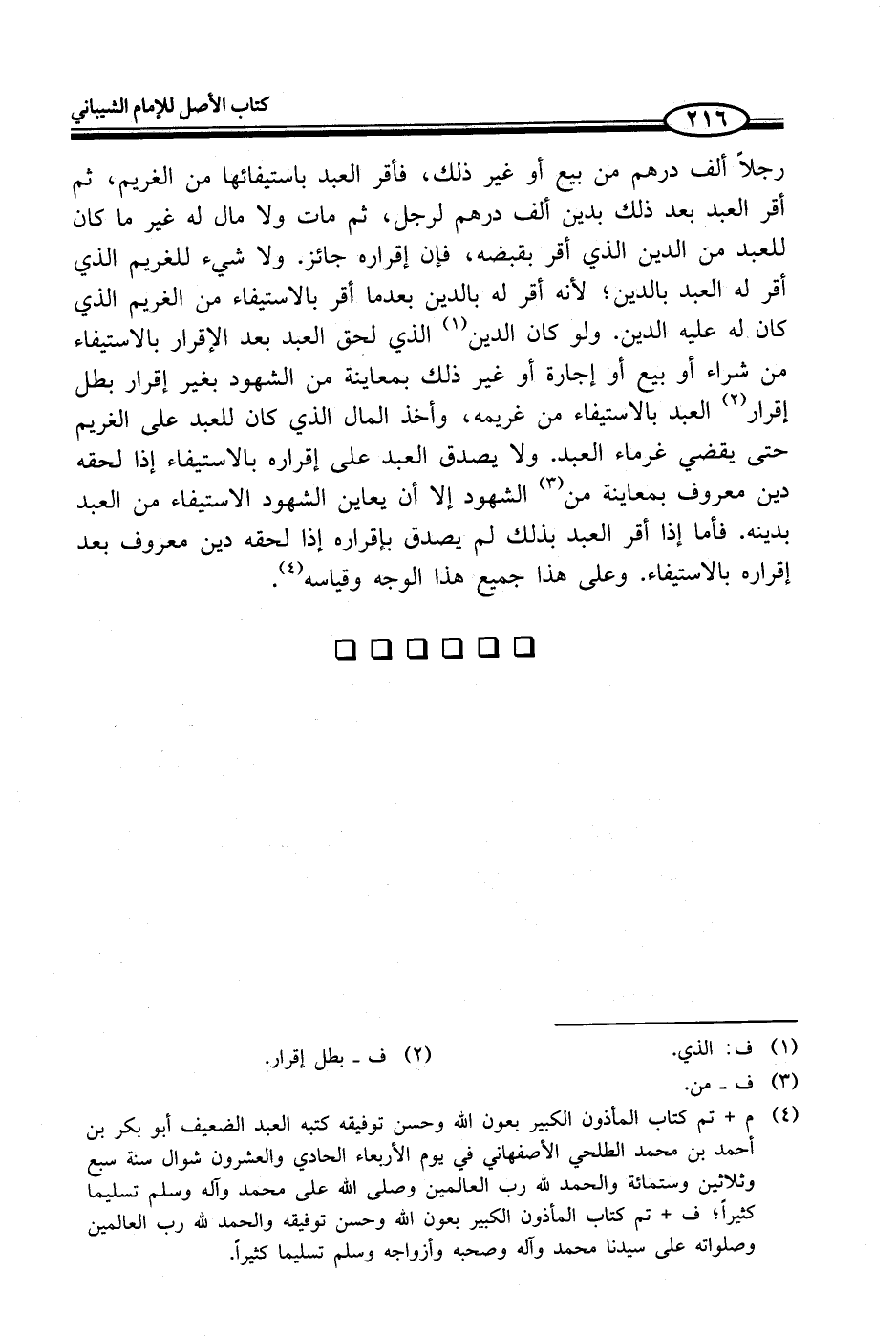 (¬4) م + تم كتاب المأذون الكبير بعون الله وحسن توفيقه كتبه العبد الضعيف أبو بكر بن أحمد بن محمد الطلحي الأصفهاني في يوم الأربعاء الحادي والعشرون شوال سنة سبع وثلاثين وستمائة والحمد لله رب العالمين وصلى الله على محمد وآله وسلم تسليما كثيراً؛ ف + تم كتاب المأذون الكبير بعون الله وحسن توفيقه والحمد لله رب العالمين وصلواته على سيدنا محمد وآله وصحبه وأزواجه وسلم تسليما كثيراً.