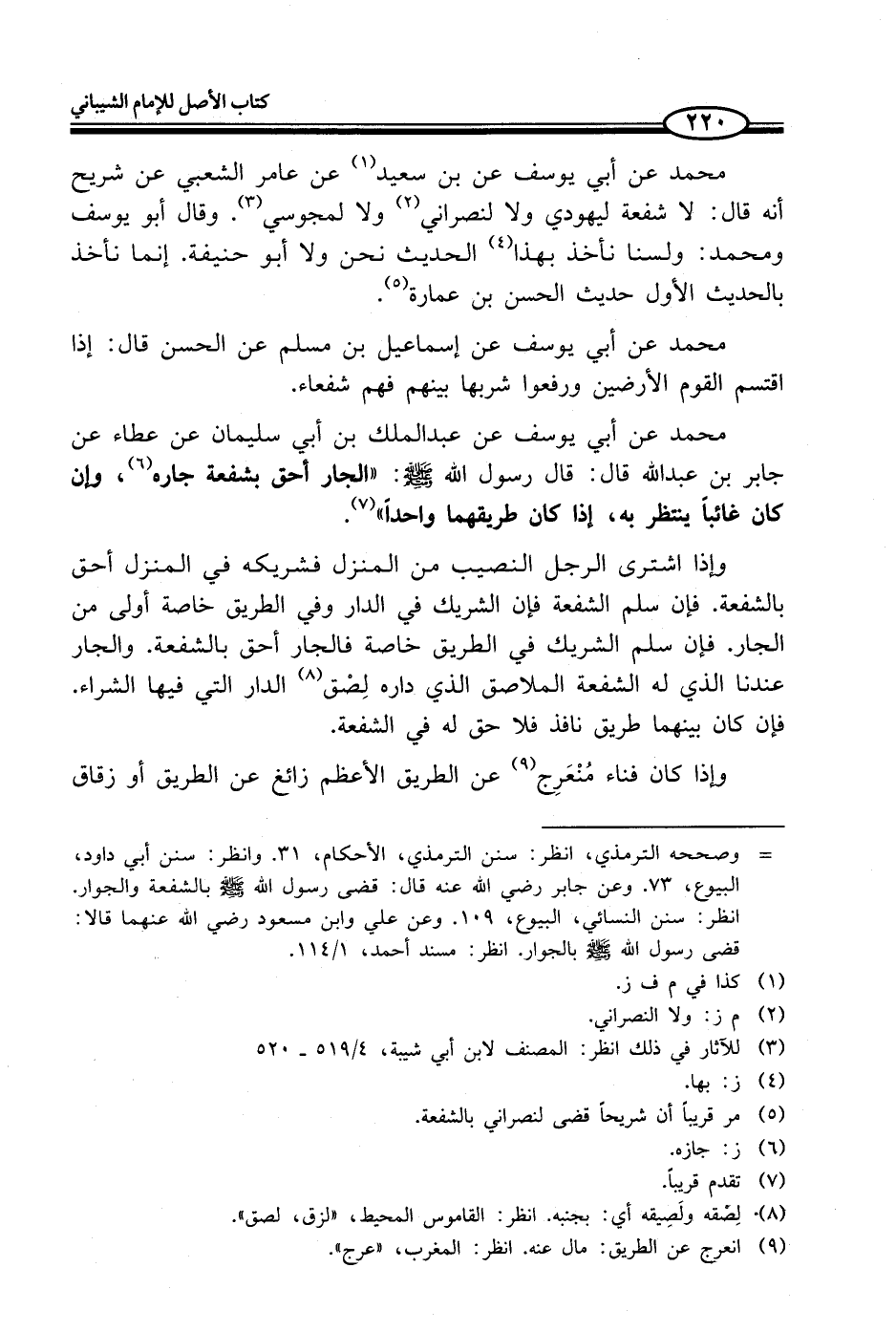 محمد عن أبي يوسف عن بن سعيد (¬1) عن عامر الشعبي عن شريح أنه قال: لا شفعة ليهودي ولا لنصراني (¬2) ولا لمجوسي (¬3). وقال أبو يوسف ومحمد: ولسنا نأخذ بهذا (¬4) الحديث نحن ولا أبو حنيفة. إنما نأخذ بالحديث الأول حديث الحسن بن عمارة (¬5).