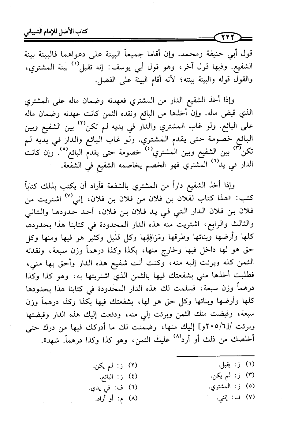 وإذا أخذ الشفيع داراً من المشتري بالشفعة فأراد أن يكتب بذلك كتاباً كتب: "هذا كتاب لفلان بن فلان من فلان بن فلان، إني (¬7) اشتريت من فلان بن فلان الدار التي في يد فلان بن فلان، أحد حدودها والثاني والثالث والرابع، اشتريت منه هذه الدار المحدودة في كتابنا هذا بحدودها كلها وأرضها وبنائها وطرقها ومَرَافِقِها وكل قليل وكثير هو فيها ومنها وكل حق هو لها داخل فيها وخارج منها، بكذا وكذا درهماً وزن سبعة، ونقدته الثمن كله وبرئت إليه منه، وكنت أنت شفيع هذه الدار وأحق بها مني، فطلبت أخذها مني بشفعتك فيها بالثمن الذي اشتريتها به، وهو كذا وكذا درهماً وزن سبعة، فسلمت لك هذه الدار المحدودة في كتابنا هذا بحدودها كلها وأرضها وبنائها وكل حق هو لها، بشفعتك فيها بكذا وكذا درهماً وزن سبعة، وقبضت منك الثمن وبرئت إلي منه، ودفعت إليك هذه الدار وقبضتها وبرئت إليك منها، وضمنت لك ما أدركك فيها من درك حتى أخلصك من ذلك أو أرد (¬8) عليك الثمن، وهو كذا وكذا درهماً. شهد".