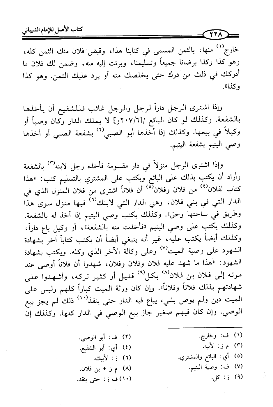 وإذا اشترى الرجل منزلاً في دار مقسومة فأخذه رجل لابنه (¬3) بالشفعة وأراد أن يكتب بذلك على البائع ويكتب على المشتري بالتسليم كتب: "هذا كتاب لفلان (¬4) من فلان وفلان (¬5) أن فلاناً اشترى من فلان المنزل الذي في الدار التي في فلان، وهي الدار التي لابنك (¬6) فيها منزل سوى هذا وطريق في ساحتها وحق". وكذلك يكتب وصي اليتيم إذا أخذ له بالشفعة. وكذلك يكتب على وصي اليتيم "فأخذت منه بالشفعة"، أو وكيل باع داراً، وكذلك أيضاً يكتب عليه، غير أنه ينبغي أيضاً أن يكتب كتاباً آخر بشهادة الشهود على وصية الميت (¬7) وعلى وكالة الآخر الذي وكله. ويكتب بشهادة الشهود: "هذا ما شهد عليه فلان وفلان وفلان، شهدوا أن فلاناً أوصى عند موته إلى فلان بن فلان (¬8) بكل (¬9) قليل أو كثير تركه، وأشهدوا على شهادتهم بذلك فلاناً وفلانًا". وإن كان ورثة الميت كباراً كلهم وليس على الميت دين ولم يوص بشيء يباع فيه الدار حتى ينفذ (¬10) ذلك لم يجز بيع الوصي. وإن كان فيهم صغير جاز بيع الوصي في الدار كلها. وكذلك إن