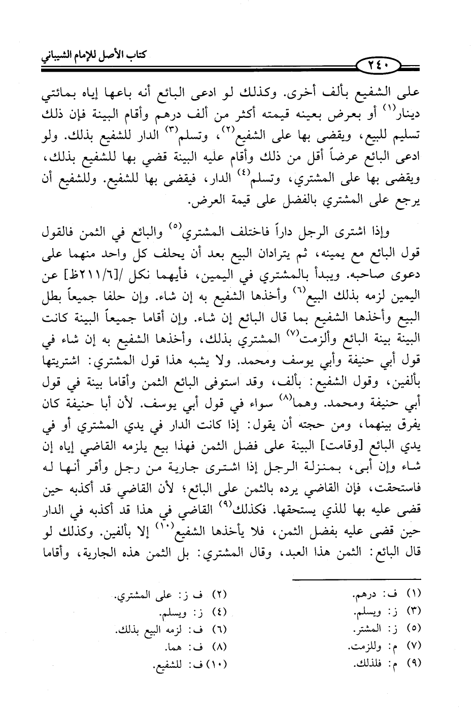 وإذا اشترى الرجل داراً فاختلف المشتري (¬5) والبائع في الثمن فالقول قول البائع مع يمينه، ثم يترادان البيع بعد أن يحلف كل واحد منهما على دعوى صاحبه. ويبدأ بالمشتري في اليمين، فأيهما نكل عن اليمين لزمه بذلك البيع (¬6) وأخذها الشفيع به إن شاء. وإن حلفا جميعاً بطل البيع وأخذها الشفيع بما قال البائع إن شاء. وإن أقاما جميعاً البينة كانت البينة بينة البائع وألزمت (¬7) المشتري بذلك، وأخذها الشفيع به إن شاء في قول أبي حنيفة وأبي يوسف ومحمد. ولا يشبه هذا قول المشتري: اشتريتها بألفين، وقول الشفيع: بألف، وقد استوفى البائع الثمن وأقاما بينة في قول أبي حنيفة ومحمد. وهما (¬8) سواء في قول أبي يوسف. لأن أبا حنيفة كان يفرق بينهما، ومن حجته أن يقول: إذا كانت الدار في يدي المشتري أو في يدي البائع [وقامت] البينة على فضل الثمن فهذا بيع يلزمه القاضي إياه إن شاء وإن أبى، بمنزلة الرجل إذا اشترى جارية من رجل وأقر أنها له فاستحقت، فإن القاضي يرده بالثمن على البائع؛ لأن القاضي قد أكذبه حين قضى عليه بها للذي يستحقها. فكذلك (¬9) القاضي في هذا قد أكذبه في الدار حين قضى عليه بفضل الثمن، فلا يأخذها الشفيع (¬10) إلا بألفين. وكذلك لو قال البائع: الثمن هذا العبد، وقال المشتري: بل الثمن هذه الجارية، وأقاما