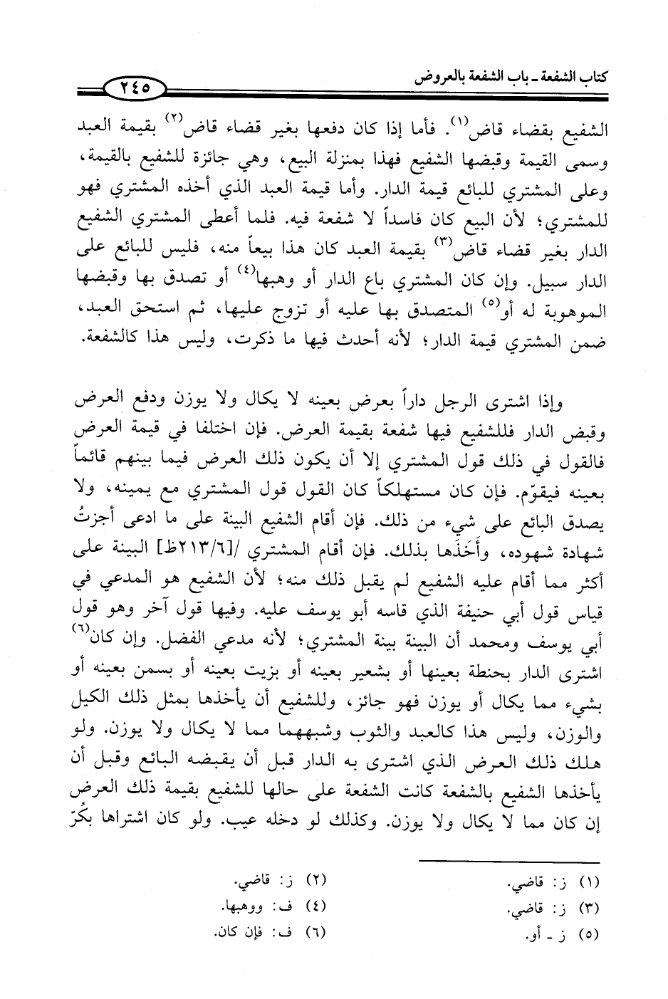 وإذا اشترى الرجل داراً بعرض بعينه لا يكال ولا يوزن ودفع العرض وقبض الدار فللشفيع فيها شفعة بقيمة العرض. فإن اختلفا في قيمة العرض فالقول في ذلك قول المشتري إلا أن يكون ذلك العرض فيما بينهم قائماً بعينه فيقوّم. فإن كان مستهلكاً كان القول قول المشتري مع يمينه، ولا يصدق البائع على شيء من ذلك. فإن أقام الشفيع البينة على ما ادعى أجزتُ شهادة شهوده، وأَخَذَها بذلك. فإن أقام المشتري البينة على أكثر مما أقام عليه الشفيع لم يقبل ذلك منه؛ لأن الشفيع هو المدعي في قياس قول أبي حنيقة الذي قاسه أبو يوسف عليه. وفيها قول آخر وهو قول أبي يوسف ومحمد أن البينة بينة المشتري؛ لأنه مدعي الفضل. وإن كان (¬6) اشترى الدار بحنطة بعينها أو بشعير بعينه أو بزيت بعينه أو بسمن بعينه أو بشيء مما يكال أو يوزن فهو جائز، وللشفيع أن يأخذها بمثل ذلك الكيل والوزن، وليس هذا كالعبد والثوب وشبههما مما لا يكال ولا يوزن. ولو هلك ذلك العرض الذي اشترى به الدار قبل أن يقبضه البائع وقبل أن يأخذها الشفيع بالشفعة كانت الشفعة على حالها للشفيع بقيمة ذلك العرض إن كان مما لا يكال ولا يوزن. وكذلك لو دخله عيب. ولو كان اشتراها بكُرّ
