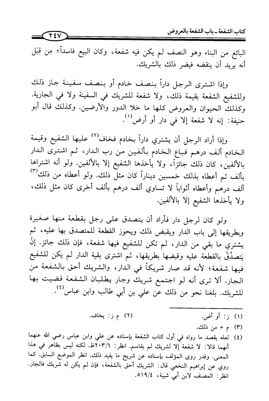 (¬4) لعله يقصد ما رواه في أول كتاب الشفعة بإسناده عن علي وابن عباس - رضي الله عنهما - أنهما قالا: لا شفعة إلا لشريك لم يقاسم. انظر: 6/ 203 ظ. لكنه ليس بظاهر في هذا المعنى. وقدر روى المؤلف بإسناده عن شريح ما يفيد ذلك. انظر الموضع السابق. كما روي عن إبراهيم النخعي قال: الشريك أحق بالشفعة، فإن لم يكن له شريك فالجار. انظر: المصنف لابن أبي شيبة، 4/ 519.
