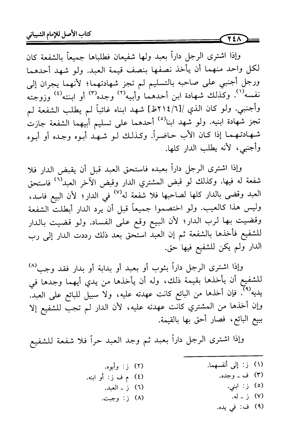 وإذا اشترى الرجل داراً بعبد ولها شفيعان فطلباها جميعاً بالشفعة كان لكل واحد منهما أن يأخذ نصفها بنصف قيمة العبد. ولو شهد أحدهما ورجل أجنبي على صاحبه بالتسليم لم تجز شهادتهما؛ لأنهما يجران إلى نفسه (¬1). وكذلك شهادة ابن أحدهما وأبيه (¬2) وجده (¬3) أو ابنته (¬4) وزوجته وأجنبي. ولو كان الذي شهد ابناه غائباً لم يطلب الشفعة لم تجز شهادة ابنيه. ولو شهد ابنا (¬5) أحدهما على تسليم أبيهما الشفعة جازت شهادتهما إذا كان الأب حاضراً. وكذلك لو شهد أبوه وجده أو أبوه وأجنبي، لأنه يطلب الدار كلها.