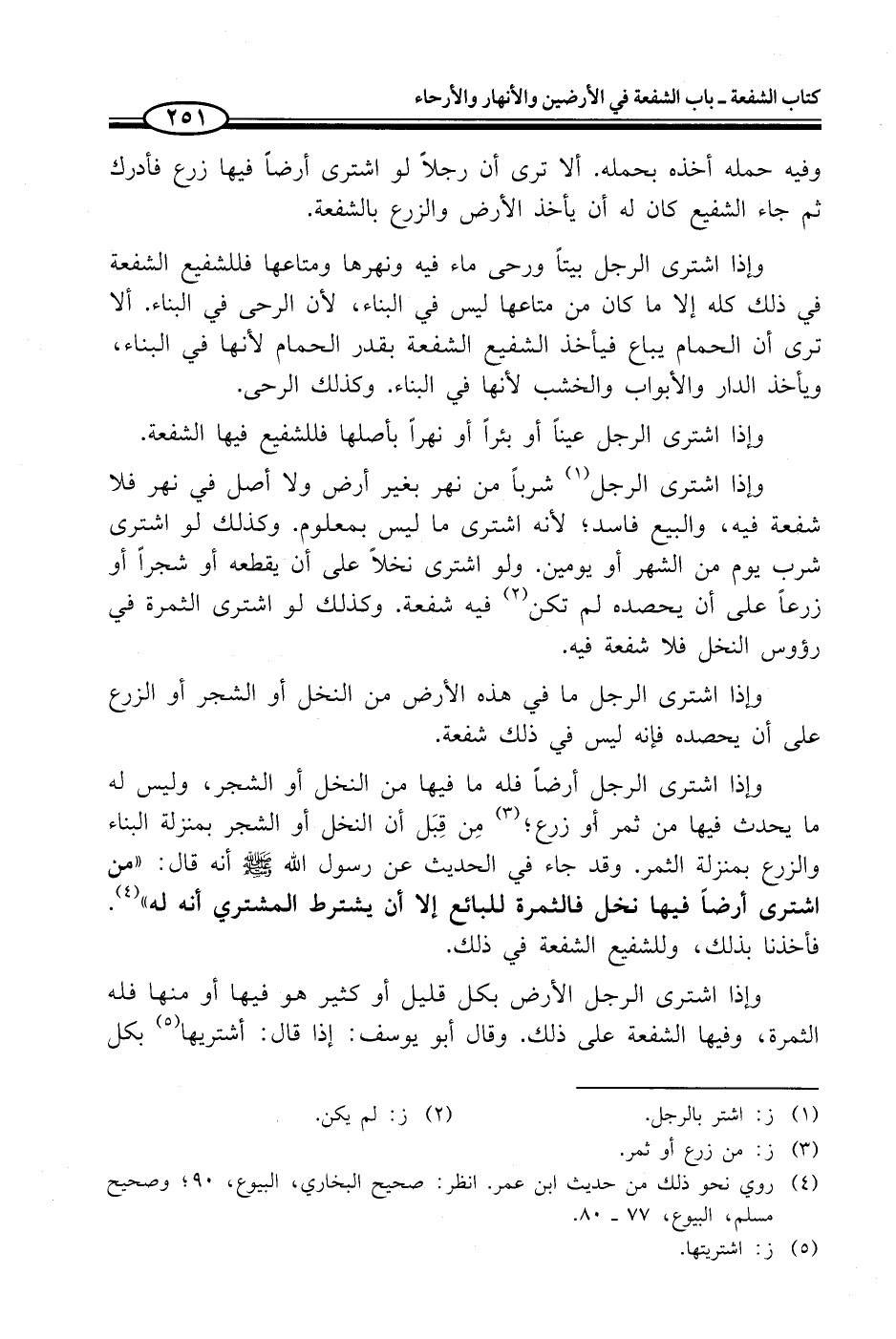 وإذا اشترى الرجل أرضاً فله ما فيها من النخل أو الشجر، وليس له ما يحدث فيها من ثمر أو زرع؛ (¬3) مِن قِبَل أن النخل أو الشجر بمنزلة البناء والزرع بمنزلة الثمر. وقد جاء في الحديث عن رسول الله - صلى الله عليه وسلم - أنه قال: "من اشترى أرضاً فيها نخل فالثمرة للبائع إلا أن يشترط المشتري أنه له" (¬4). فأخذنا بذلك، وللشفيع الشفعة في ذلك.