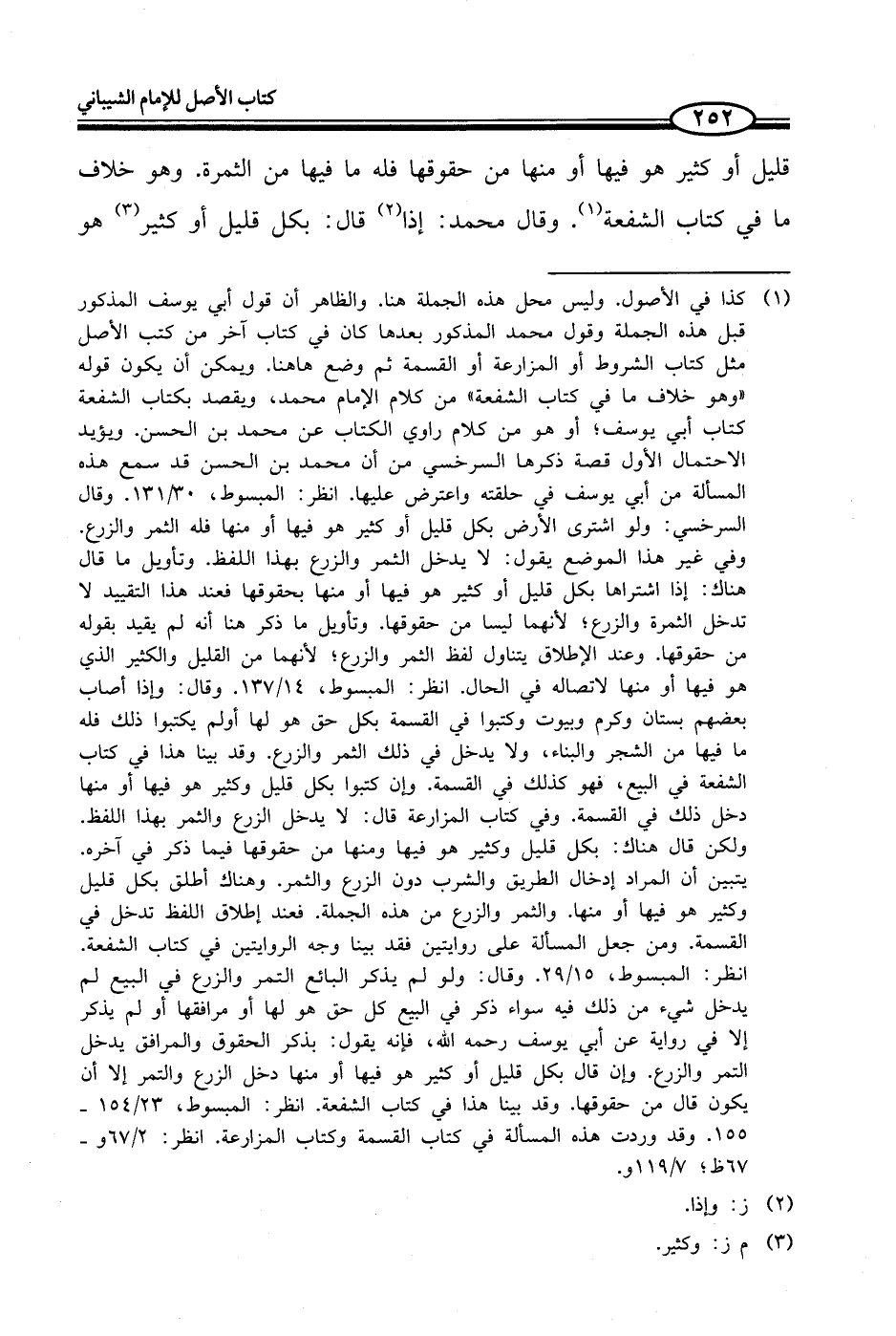 (¬1) كذا في الأصول. وليس محل هذه الجملة هنا. والظاهر أن قول أبي يوسف المذكور قبل هذه الجملة وقول محمد المذكور بعدها كان في كتاب آخر من كتب الأصل مثل كتاب الشروط أو المزارعة أو القسمة ثم وضع هاهنا. ويمكن أن يكون قوله "وهو خلاف ما في كتاب الشفعة" من كلام الإمام محمد، ويقصد بكتاب الشفعة كتاب أبي يوسف؛ أو هو من كلام راوي الكتاب عن محمد بن الحسن. ويؤيد الاحتمال الأول قصة ذكرها السرخسي من أن محمد بن الحسن قد سمع هذه المسألة من أبي يوسف في حلقته واعترض عليها. انظر: المبسوط، 30/ 131. وقال السرخسي: ولو اشترى الأرض بكل قليل أو كثير هو فيها أو منها فله الثمر والزرع. وفي غير هذا الموضع يقول: لا يدخل الثمر والزرع بهذا اللفظ. وتأويل ما قال هناك: إذا اشتراها بكل قليل أو كثير هو فيها أو منها بحقوقها فعند هذا التقييد لا تدخل الثمرة والزرع؛ لأنهما ليسا من حقوقها. وتأويل ما ذكر هنا أنه لم يقيد بقوله من حقوقها. وعند الإطلاق يتناول لفظ الثمر والزرع؛ لأنهما من القليل والكثير الذي هو فيها أو منها لاتصاله في الحال. انظر: المبسوط، 14/ 137. وقال: وإذا أصاب بعضهم بستان وكرم وبيوت وكتبوا في القسمة بكل حق هو لها أولم يكتبوا ذلك فله ما فيها من الشجر والبناء، ولا يدخل في ذلك الثمر والزرع. وقد بينا هذا في كتاب الشفعة في البيع، فهو كذلك في القسمة. وإن كتبوا بكل قليل وكثير هو فيها أو منها دخل ذلك في القسمة. وفي كتاب المزارعة قال: لا يدخل الزرع والثمر بهذا اللفظ. ولكن قال هناك: بكل قليل وكثير هو فيها ومنها من حقوقها فيما ذكر في آخره. يتبين أن المراد إدخال الطريق والشرب دون الزرع والثمر. وهناك أطلق بكل قليل وكثير هو فيها أو منها. والثمر والزرع من هذه الجملة. فعند إطلاق اللفظ تدخل في القسمة. ومن جعل المسألة على روايتين فقد بينا وجه الروايتين في كتاب الشفعة. انظر: المبسوط، 15/ 29. وقال: ولو لم يذكر البائع التمر والزرع في البيع لم يدخل شيء من ذلك فيه سواء ذكر في البيع كل حق هو لها أو مرافقها أو لم يذكر إلا في ر واية عن أبي يوسف -رحمه الله-، فإنه يقول: بذكر الحقوق والمرافق يدخل التمر والزرع. وإن قال بكل قليل أو كثير هو فيها أو منها دخل الزرع والتمر إلا أن يكون قال من حقوقها. وقد بينا هذأ في كتاب الشفعة. انظر: المبسوط، 23/ 154 - 155. وقد وردت هذه المسألة في كتاب القسمة وكتاب المزارعة. انظر: 2/ 67 و - 67 ظ؛ 7/ 119 و.