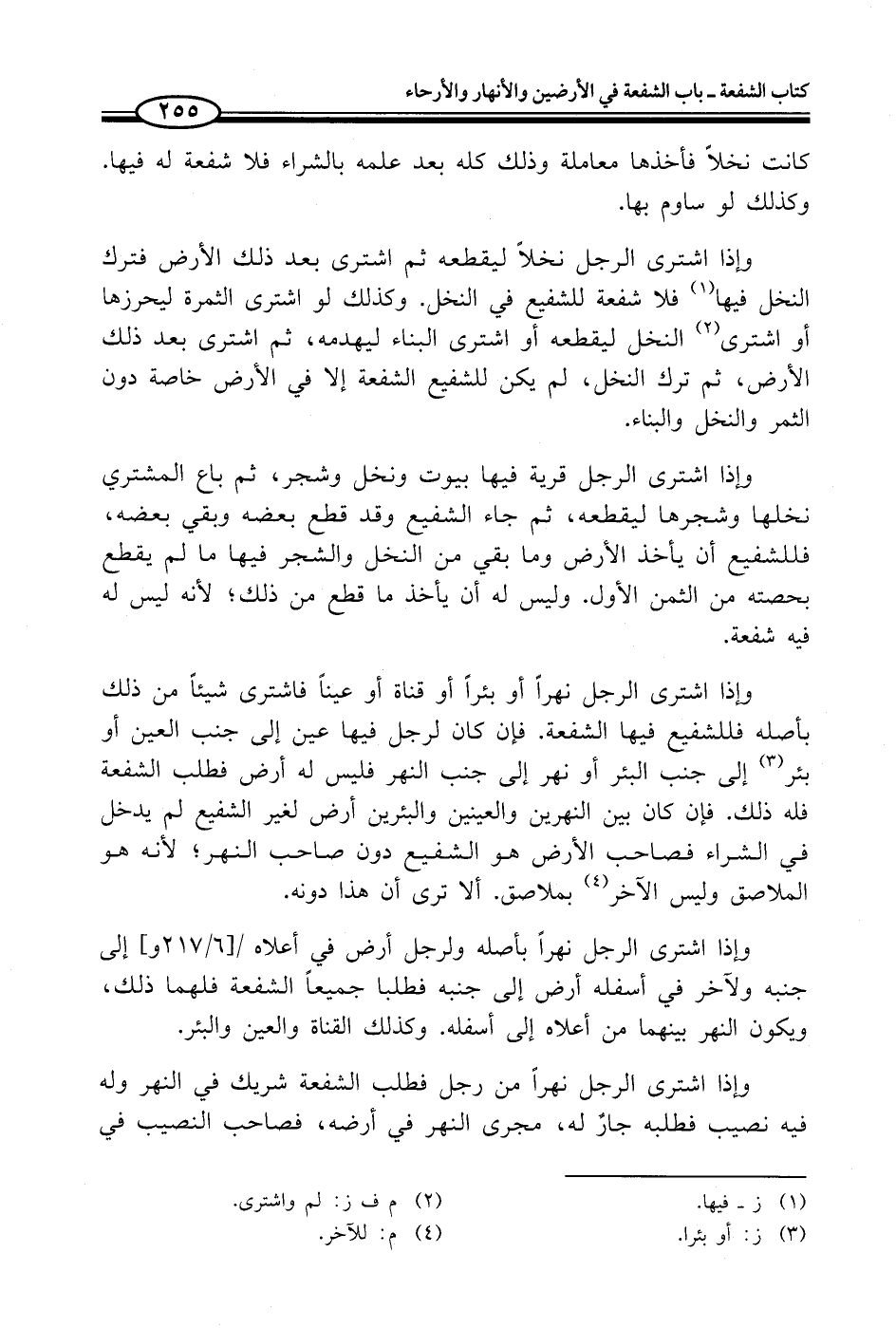 وإذا اشترى الرجل نهراً أو بئراً أو قناة أو عيناً فاشترى شيئاً من ذلك بأصله فللشفيع فيها الشفعة. فإن كان لرجل فيها عين إلى جنب العين أو بئر (¬3) إلى جنب البئر أو نهر إلى جنب النهر فليس له أرض فطلب الشفعة فله ذلك. فإن كان بين النهرين والعينين والبئرين أرض لغير الشفيع لم يدخل في الشراء فصاحب الأرض هو الشفيع دون صاحب النهر؛ لأنه هو الملاصق وليس الآخر (¬4) بملاصق. ألا ترى أن هذا دونه.