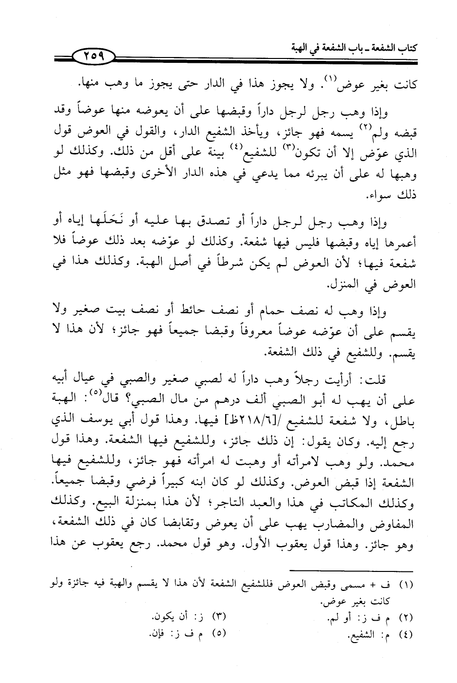 قلت: أرأيت رجلاً وهب داراً له لصبي صغير والصبي في عيال أبيه على أن يهب له أبو الصبي ألف درهم من مال الصبي؟ قال (¬5): الهبة باطل، ولا شفعة للشفيع فيها. وهذا قول أبي يوسف الذي رجع إليه. وكان يقول: إن ذلك جائز، وللشفيع فيها الشفعة. وهذا قول محمد. ولو وهب لامرأته أو وهبت له امرأته فهو جائز، وللشفيع فيها الشفعة إذا قبض العوض. وكذلك لو كان ابنه كبيراً فرضي وقبضا جميعاً. وكذلك المكاتب في هذا والعبد التاجر؛ لأن هذا بمنزلة البيع. وكذلك المفاوض والمضارب يهب على أن يعوض وتقابضا كان في ذلك الشفعة، وهو جائز. وهذا قول يعقوب الأول. وهو قول محمد. رجع يعقوب عن هذا