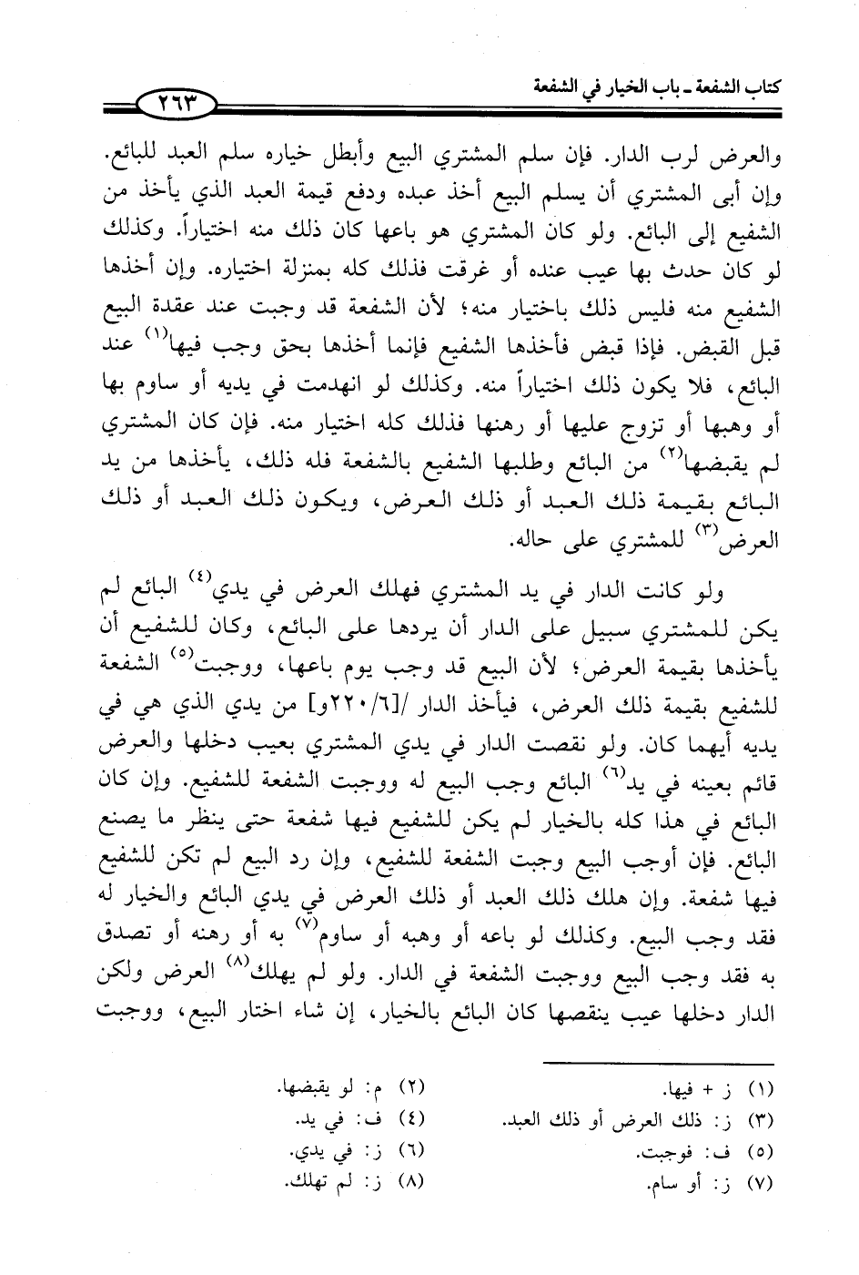 ولو كانت الدار في يد المشتري فهلك العرض في يدي (¬4) البائع لم يكن للمشتري سبيل على الدار أن يردها على البائع، وكان للشفيع أن يأخذها بقيمة العرض؛ لأن البيع قد وجب يوم باعها، ووجبت (¬5) الشفعة للشفيع بقيمة ذلك العرض، فيأخذ الدار من يدي الذي هي في يديه أيهما كان. ولو نقصت الدار في يدي المشتري بعيب دخلها والعرض قائم بعينه في يد (¬6) البائع وجب البيع له ووجبت الشفعة للشفيع. وإن كان البائع في هذا كله بالخيار لم يكن للشفيع فيها شفعة حتى ينظر ما يصنع البائع. فإن أوجب البيع وجبت الشفعة للشفيع، وإن رد البيع لم تكن للشفيع فيها شفعة. وإن هلك ذلك العبد أو ذلك العرض في يدي البائع والخيار له فقد وجب البيع. وكذلك لو باعه أو وهبه أو ساوم (¬7) به أو رهنه أو تصدق به فقد وجب البيع ووجبت الشفعة في الدار. ولو لم يهلك (¬8) العرض ولكن الدار دخلها عيب ينقصها كان البائع بالخيار، إن شاء اختار البيع، ووجبت