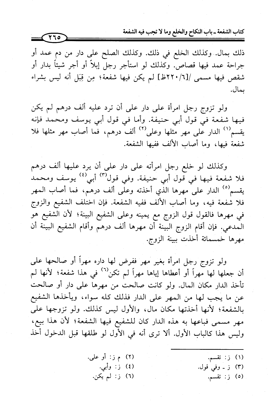 وكذلك لو خلع رجل امرأته على دار على أن يرد عليها ألف درهم فلا شفعة فيها في قول أبي حنيفة. وفي قول (¬3) أبي (¬4) يوسف ومحمد يقسم (¬5) الدار على مهرها الذي أخذته وعلى ألف درهم، فما أصاب المهر فلا شفعة فيه، وما أصاب الألف ففيه الشفعة. فإن اختلف الشفيع والزوج في مهرها فالقول قول الزوج مع يمينه وعلى الشفيع البينة؛ لأن الشفيع هو المدعي. فإن أقام الزوج البينة أن مهرها ألف درهم وأقام الشفيع البينة أن مهرها خمسمائة أخذت ببينة الزوج.