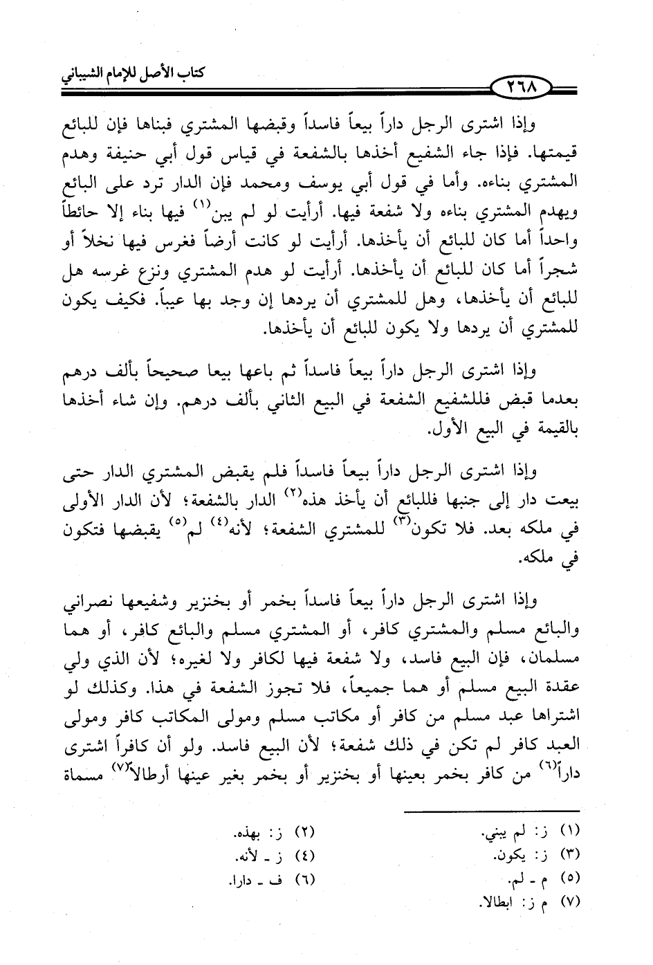 وإذا اشترى الرجل داراً بيعاً فاسداً بخمر أو بخنزير وشفيعها نصراني والبائع مسلم والمشتري كافر، أو المشتري مسلم والبائع كافر، أو هما مسلمان، فإن البيع فاسد، ولا شفعة فيها لكافر ولا لغيره؛ لأن الذي ولي عقدة البيع مسلم أو هما جميعاً، فلا تجوز الشفعة في هذا. وكذلك لو اشتراها عبد مسلم من كافر أو مكاتب مسلم ومولى المكاتب كافر ومولى العبد كافر لم تكن في ذلك شفعة؛ لأن البيع فاسد. ولو أن كافراً اشترى داراً (¬6) من كافر بخمر بعينها أو بخنزير أو بخمر بغير عينها أرطالاً (¬7) مسماة