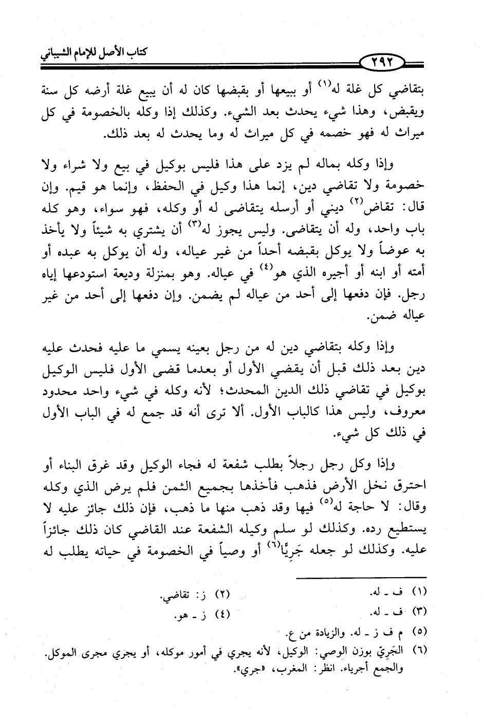 وإذا وكل رجل رجلاً بطلب شفعة له فجاء الوكيل وقد غرق البناء أو احترق نخل الأرض فذهب فأخذها بجميع الثمن فلم يرض الذي وكله وقال: لا حاجة له (¬5) فيها وقد ذهب منها ما ذهب، فإن ذلك جائز عليه لا يستطيع رده. وكذلك لو سلم وكيله الشفعة عند القاضي كان ذلك جائزاً عليه. وكذلك لو جعله جَرِيًّا (¬6) أو وصياً في الخصومة في حياته يطلب له