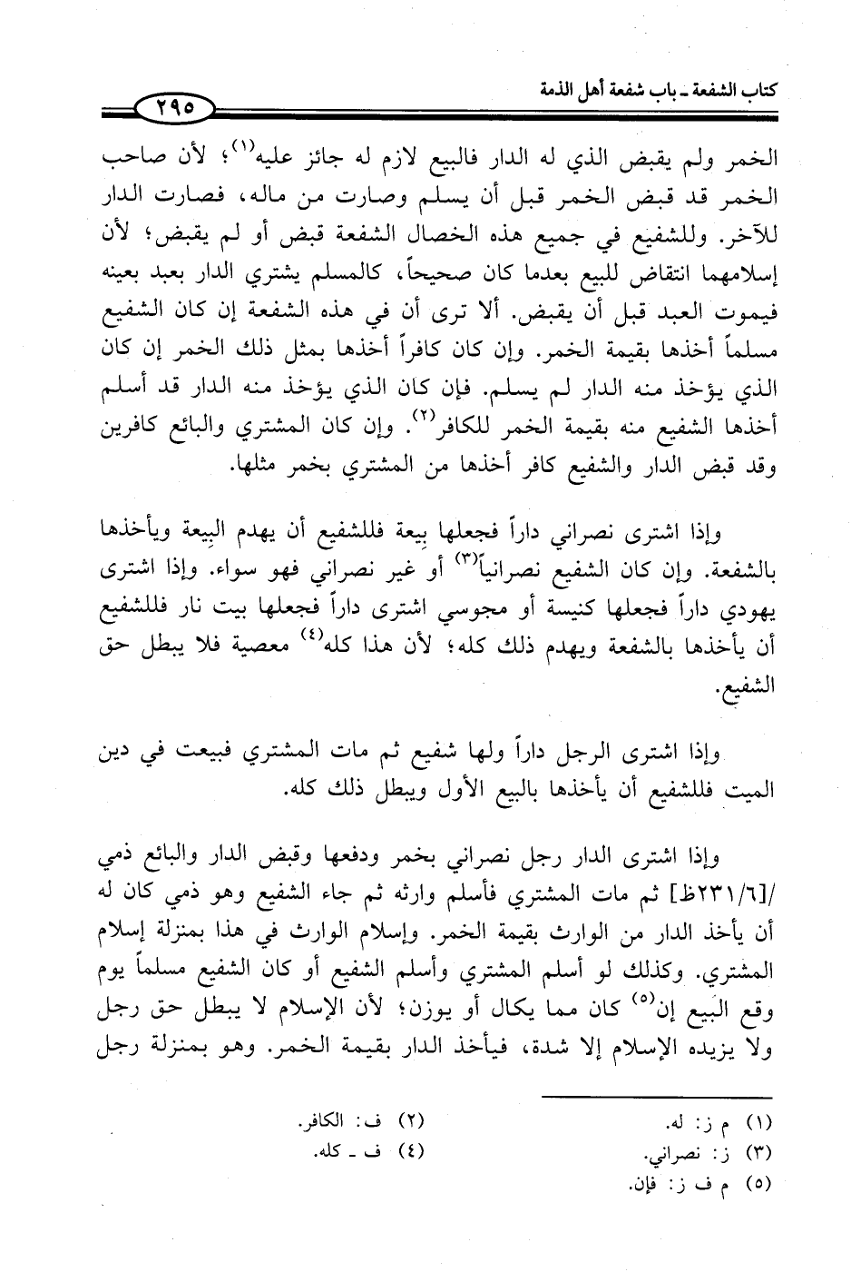 الخمر ولم يقبض الذي له الدار فالبيع لازم له جائز عليه (¬1)؛ لأن صاحب الخمر قد قبض الخمر قبل أن يسلم وصارت من ماله، فصارت الدار للآخر. وللشفيع في جميع هذه الخصال الشفعة قبض أو لم يقبض؛ لأن إسلامهما انتقاض للبيع بعدما كان صحيحاً، كالمسلم يشتري الدار بعبد بعينه فيموت العبد قبل أن يقبض. ألا ترى أن في هذه الشفعة إن كان الشفيع مسلماً أخذها بقيمة الخمر. وإن كان كافراً أخذها بمثل ذلك الخمر إن كان الذي يؤخذ منه الدار لم يسلم. فإن كان الذي يؤخذ منه الدار قد أسلم أخذها الشفيع منه بقيمة الخمر للكافر (¬2). وإن كان المشتري والبائع كافرين وقد قبض الدار والشفيع كافر أخذها من المشتري بخمر مثلها.