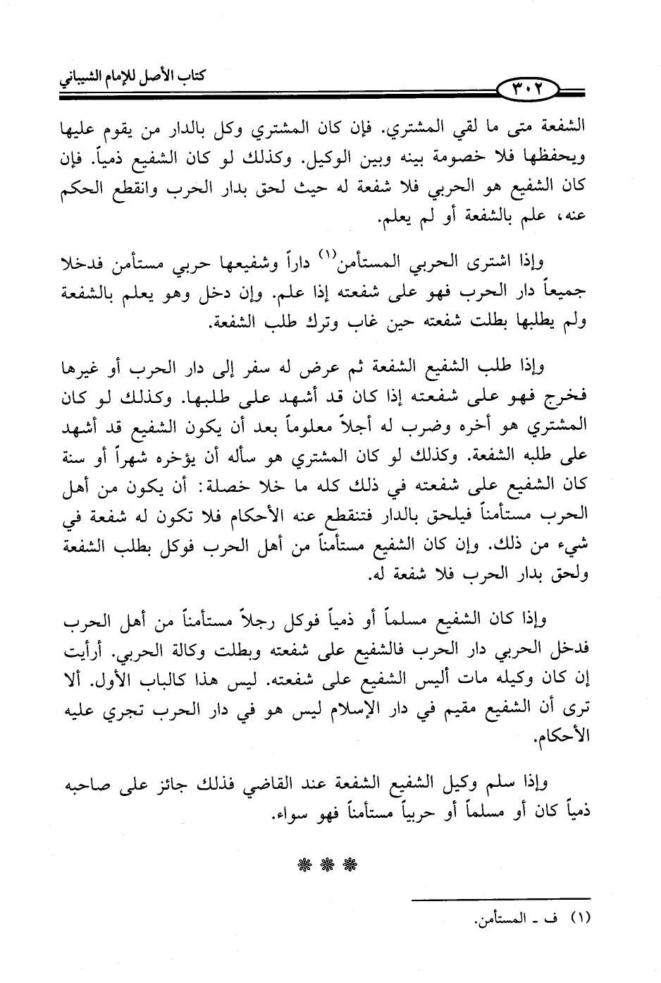 وإذا كان الشفيع مسلماً أو ذمياً فوكل رجلاً مستأمناً من أهل الحرب فدخل الحربي دار الحرب فالشفيع على شفعته وبطلت وكالة الحربي. أرأيت إن كان وكيله مات أليس الشفيع على شفعته. ليس هذا كالباب الأول. ألا ترى أن الشفيع مقيم في دار الإسلام ليس هو في دار الحرب تجري عليه الأحكام.