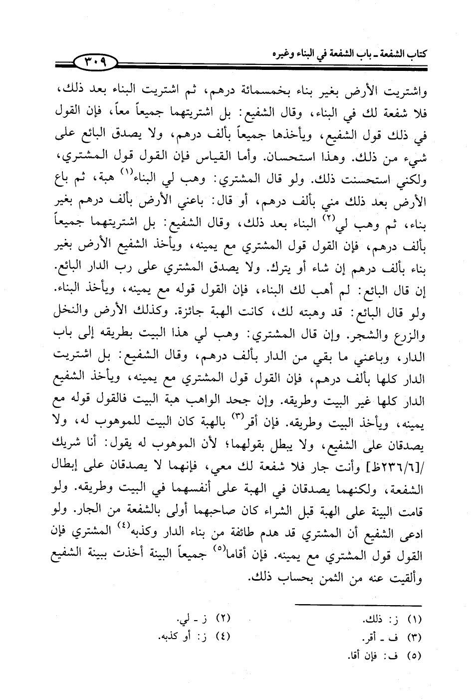 واشتريت الأرض بغير بناء بخمسمائة درهم، ثم اشتريت البناء بعد ذلك، فلا شفعة لك في البناء، وقال الشفيع: بل اشتريتهما جميعاً معاً، فإن القول في ذلك قول الشفيع، ويأخذها جميعاً بألف درهم، ولا يصدق البائع على شيء من ذلك. وهذا استحسان. وأما القياس فإن القول قول المشتري، ولكني استحسنت ذلك. ولو قال المشتري: وهب لي البناء (¬1) هبة، ثم باع الأرض بعد ذلك مني بألف درهم، أو قال: باعني الأرض بألف درهم بغير بناء، ثم وهب لي (¬2) البناء بعد ذلك، وقال الشفيع: بل اشتريتهما جميعاً بألف درهم، فمان القول قول المشتري مع يمينه، ويأخذ الشفيع الأرض بغير بناء بألف درهم إن شاء أو يتركء ولا يصدق المشتري على رب الدار البائع. إن قال البائع: لم أهب لك البناء، فإن القول قوله مع يمينه، ويأخذ البناء. ولو قال البائع: قد وهبته لك، كانت الهبة جائزة. وكذلك الأرض والنخل والزرع والشجر. وإن قال المشتري: وهب لي هذا البيت بطريقه إلى باب الدار، وباعني ما بقي من الدار بألف درهم، وقال الشفيع: بل اشتريت الدار كلها بألف درهم، فإن القول قول المشتري مع يمينه، ويأخذ الشفيع الدار كلها غير البيت وطريقه. وإن جحد الواهب هبة البيت فالقول قوله مع يمينه، ويأخذ البيت وطريقه. فإن أقر (¬3) بالهبة كان البيت للموهوب له، ولا يصدقان على الشفيع، ولا يبطل بقولهما؛ لأن الموهوب له يقول: أنا شريك وأنت جار فلا شفعة لك معي، فإنهما لا يصدقان على إبطال الشفعة، ولكنهما يصدقان في الهبة على أنفسهما في البيت وطريقه. ولو قامت البينة على الهبة قبل الشراء كان صاحبهما أولى بالشفعة من الجار. ولو ادعى الشفيع أن المشتري قد هدم طائفة من بناء الدار وكذبه (¬4) المشتري فإن القول قول المشتري مع يمينه. فإن أقاما (¬5) جميعاً البينة أخذت ببينة الشفيع وألقيت عنه من الثمن بحساب ذلك.