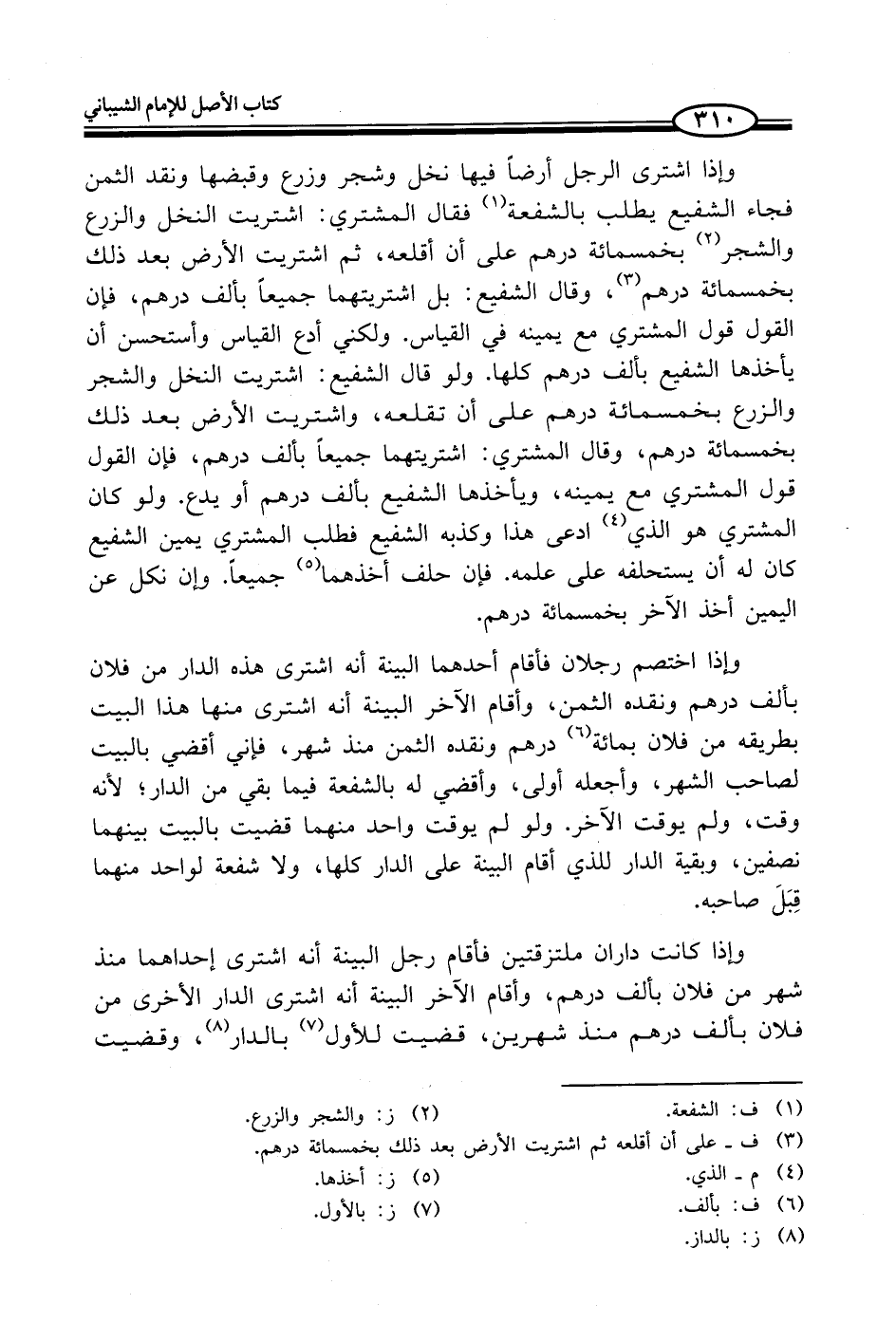 وإذا اشترى الرجل أرضاً فيها نخل وشجر وزرع وقبضها ونقد الثمن فجاء الشفيع يطلب بالشفعة (¬1) فقال المشتري: اشتريت النخل والزرع والشجر (¬2) بخمسمائة درهم على أن أقلعه، ثم اشتريت الأرض بعد ذلك بخمسمائة درهم (¬3)، وقال الشفيع: بل اشتريتهما جميعاً بألف درهم، فإن القول قول المشتري مع يمينه في القياس. ولكني أدع القياس وأستحسن أن يأخذها الشفيع بألف درهم كلها. ولو قال الشفيع: اشتريت النخل والشجر والزرع بخمسمائة درهم على أن تقلعه، واشتريت الأرض بعد ذلك بخمسمائة درهم، وقال المشتري: اشتريتهما جميعاً بألف درهم، فإن القول قول المشتري مع يمينه، ويأخذها الشفيع بألف درهم أو يدع. ولو كان المشتري هو الذي (¬4) ادعى هذا وكذبه الشفيع فطلب المشتري يمين الشفيع كان له أن يستحلفه على علمه. فإن حلف أخذهما (¬5) جميعاً. وإن نكل عن اليمين أخذ الآخر بخمسمائة درهم.
