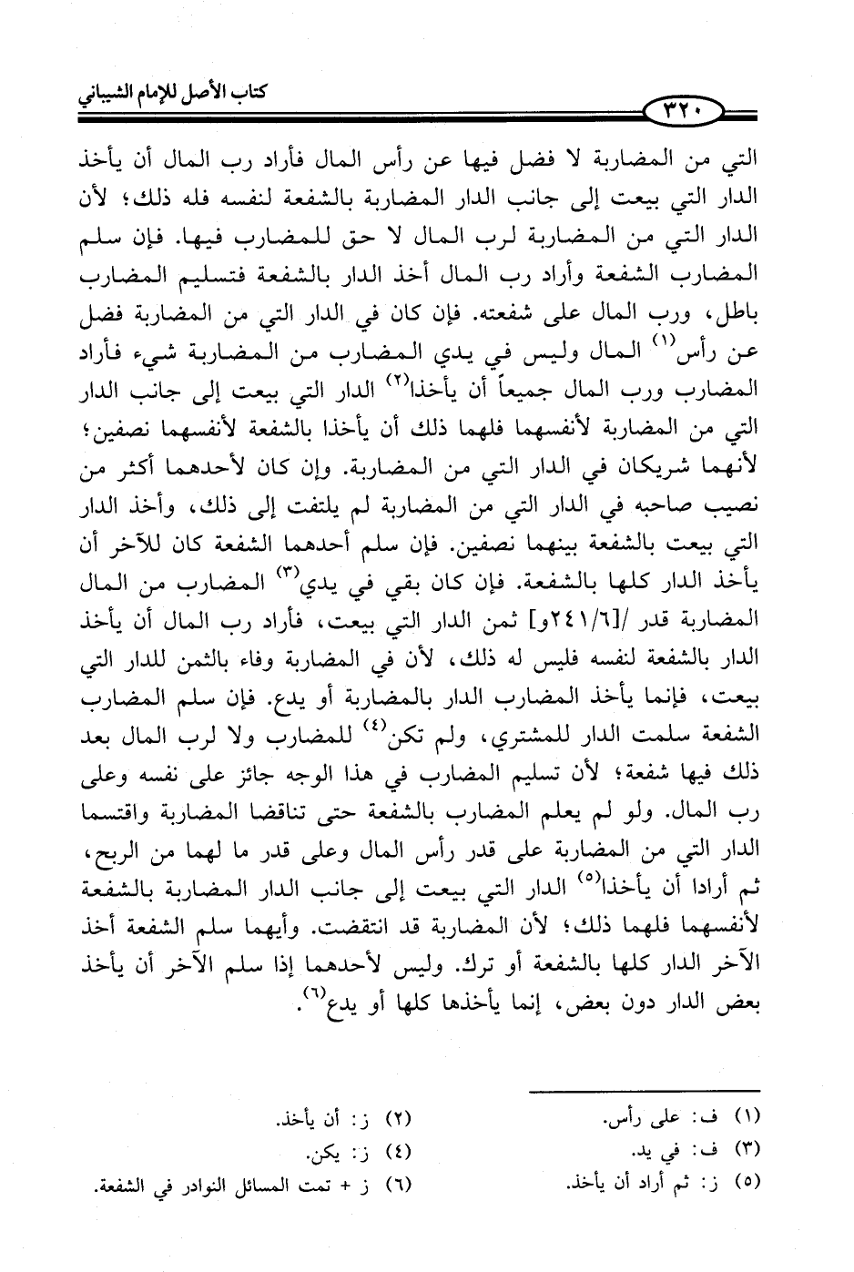 التي من المضاربة لا فضل فيها عن رأس المال فأراد رب المال أن يأخذ الدار التي بيعت إلى جانب الدار المضاربة بالشفعة لنفسه فله ذلك؛ لأن الدار التي من المضاربة لرب المال لا حق للمضارب فيها. فإن سلم المضارب الشفعة وأراد رب المال أخذ الدار بالشفعة فتسليم المضارب باطل، ورب المال على شفعته. فإن كان في الدار التي من المضاربة فضل عن رأس (¬1) المال وليس في يدي المضارب من المضاربة شيء فأراد المضارب ورب المال جميعاً أن يأخذا (¬2) الدار التي بيعت إلى جانب الدار التي من المضاربة لأنفسهما فلهما ذلك أن يأخذا بالشفعة لأنفسهما نصفين؛ لأنهما شريكان في الدار التي من المضاربة. وإن كان لأحدهما أكثر من نصيب صاحبه في الدار التي من المضاربة لم يلتفت إلى ذلك، وأخذ الدار التي بيعت بالشفعة بينهما نصفين. فإن سلم أحدهما الشفعة كان للآخر أن يأخذ الدار كلها بالشفعة، فإن كان بقي في يدي (¬3) المضارب من المال المضاربة قدر ثمن الدار التي بيعت، فأراد رب المال أن يأخذ الدار بالشفعة لنفسه فليس له ذلك، لأن في المضاربة وفاء بالثمن للدار التي بيعت، فإنما يأخذ المضارب الدار بالمضاربة أو يدع. فإن سلم المضارب الشفعة سلمت الدار للمشتري، ولم تكن (¬4) للمضارب ولا لرب المال بعد ذلك فيها شفعة؛ لأن تسليم المضارب في هذا الوجه جائز على نفسه وعلى رب المال. ولو لم يعلم المضارب بالشفعة حتى تناقضا المضاربة واقتسما الدار التي من المضاربة على قدر رأس المال وعلى قدر ما لهما من الربح، ثم أرادا أن يأخذا (¬5) الدار التي بيعت إلى جانب الدار المضاربة بالشفعة لأنفسهما فلهما ذلك؛ لأن المضاربة قد انتقضت. وأيهما سلم الشفعة أخذ الآخر الدار كلها بالشفعة أو ترك. وليس لأحدهما إذا سلم الآخر أن يأخذ بعض الدار دون بعض، إنما يأخذها كلها أو يدع (¬6).