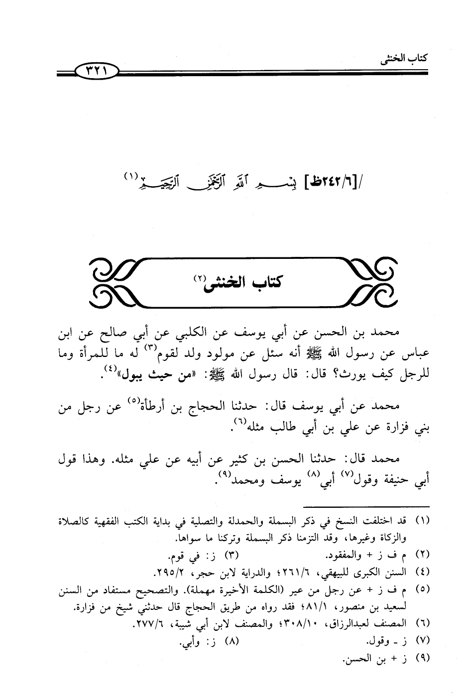 محمد بن الحسن عن أبي يوسف عن الكلبي عن أبي صالح عن ابن عباس عن رسول الله - صلى الله عليه وسلم - أنه سئل عن مولود ولد لقوم (¬3) له ما للمرأة وما للرجل كيف يورث؟ قال: قال رسول الله - صلى الله عليه وسلم -: "من حيث يبول" (¬4).