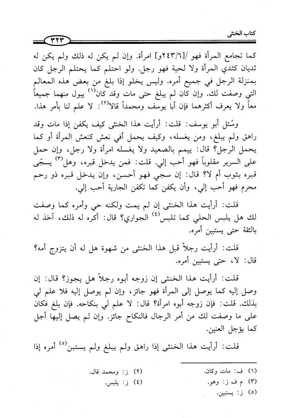كما تجامع المرأة فهو امرأة. وإن لم يكن له ذلك ولم يكن له ثديان كثدي المرأة ولا لحية فهو رجل. ولو احتلم كما يحتلم الرجل كان بمنزلة الرجل في جميع أمره. وليس يخلو إذا بلغ من بعض هذه المعالم التي وصفت لك. وإن كان لم يبلغ حتى مات وقد كان (¬1) يبول منهما جميعاً معاً ولا يعرف أكثرهما فإن أبا يوسف ومحمداً قالا (¬2): لا علم لنا بأمر هذا.