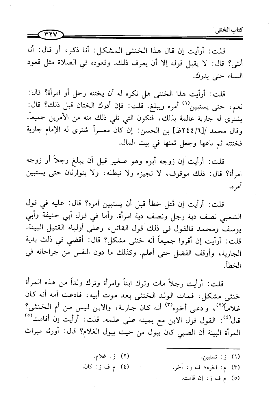 قلت: أرأيت إن قال هذا الخنثى المشكل: أنا ذكر، أو قال: أنا أنثى؟ قال: لا يقبل قوله إلا أن يعرف ذلك. وقعوده في الصلاة مثل قعود النساء حتى يدرك.