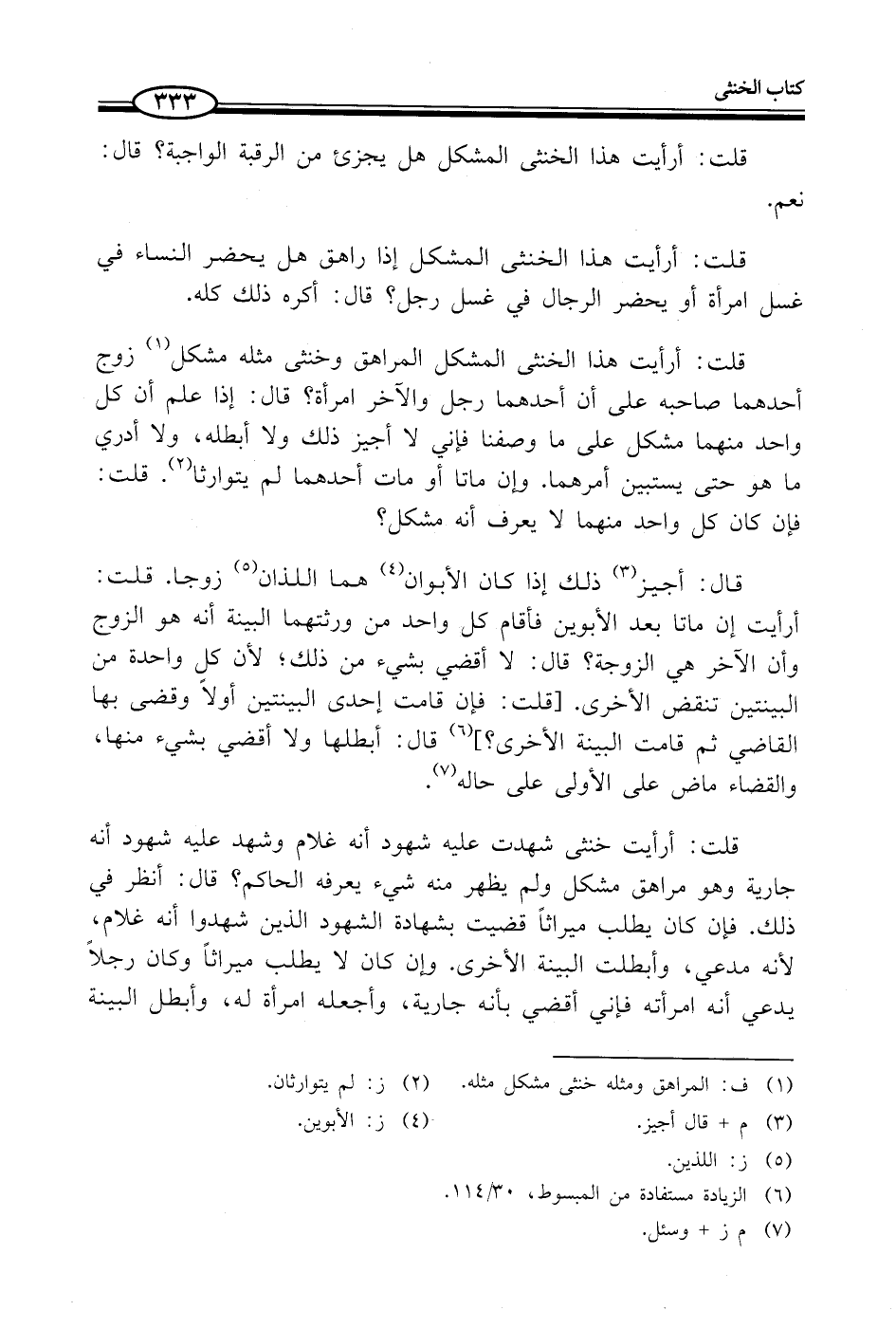 قلت: أرأيت هذا الخنثى المشكل إذا راهق هل يحضر النساء في غسل امرأة أو يحضر الرجال في غسل رجل؟ قال: أكره ذلك كله.