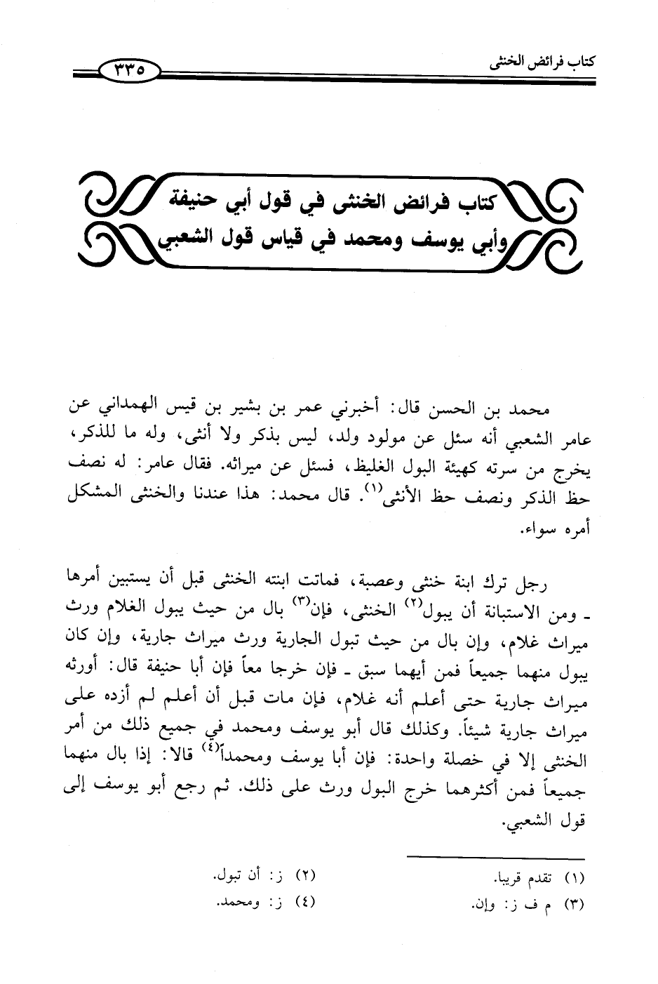 رجل ترك ابنة خنثى وعصبة، فماتت ابنته الخنثى قبل أن يستبين أمرها - ومن الاستبانة أن يبول (¬2) الخنثى، فإن (¬3) بال من حيث يبول الغلام ورث ميراث غلام، وإن بال من حيث تبول الجارية ورث ميراث جارية، وإن كان يبول منهما جميعاً فمن أيهما سبق - فإن خرجا معاً فإن أبا حنيفة قال: أورثه ميراث جارية حتى أعلم أنه غلام، فإن مات قبل أن أعلم لم أزده على ميراث جارية شيئاً. وكذلك قال أبو يوسف ومحمد في جميع ذلك من أمر الخنثى إلا في خصلة واحدة: فإن أبا يوسف ومحمداً (¬4) قالا: إذا بال منهما جميعاً فمن أكثرهما خرج البول ورث على ذلك. ثم رجع أبو يوسف إلى قول الشعبي.