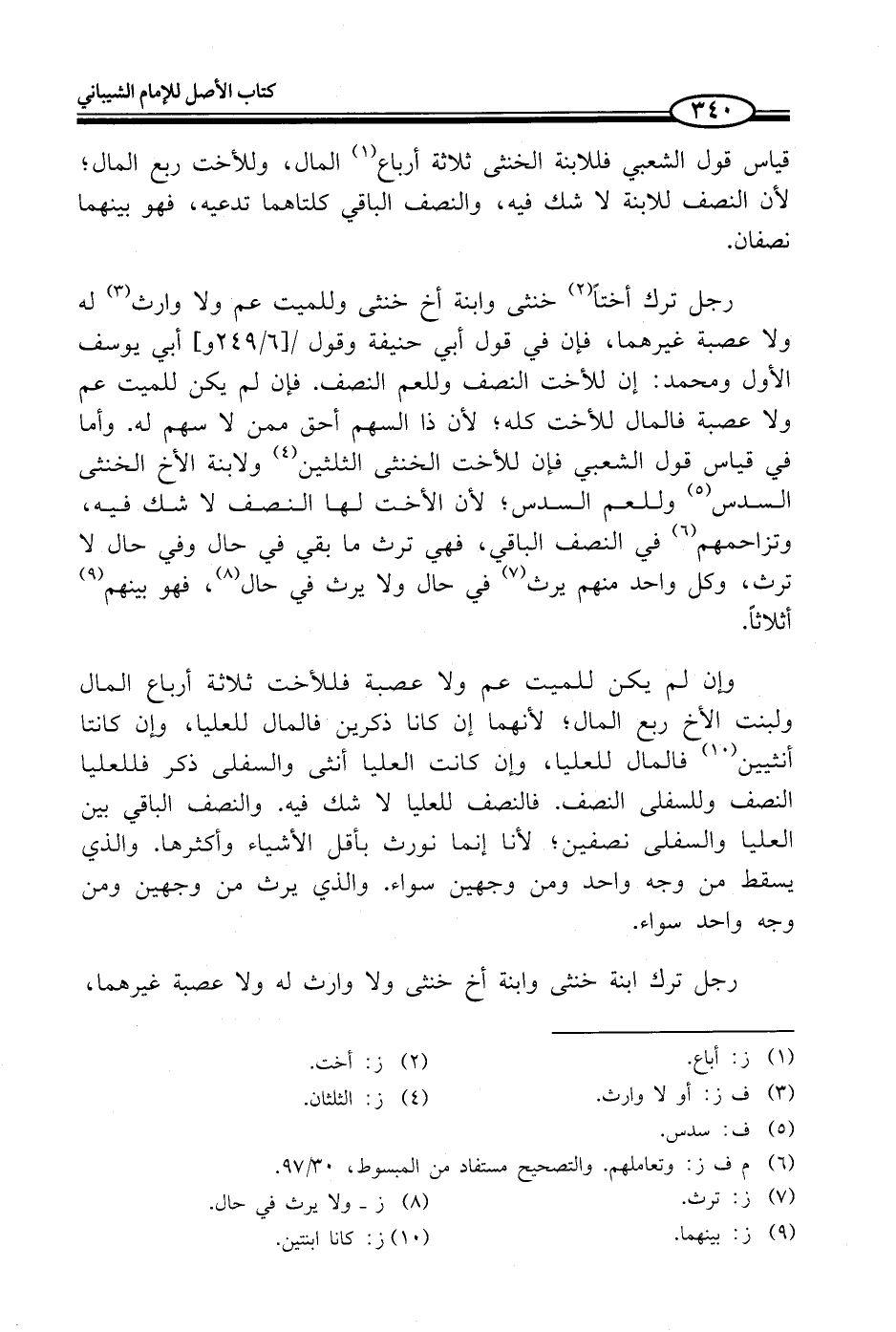 رجل ترك أختاً (¬2) خنثى وابنة أخ خنثى وللميت عم ولا وارث (¬3) له ولا عصبة غيرهما، فإن في قول أبي حنيفة وقول أبي يوسف الأول ومحمد: إن للأخت النصف وللعم النصف. فإن لم يكن للميت عم ولا عصبة فالمال للأخت كله؛ لأن ذا السهم أحق ممن لا سهم له. وأما في قياس قول الشعبي فإن للأخت الخنثى الثلثين (¬4) ولابنة الأخ الخنثى السدس (¬5) وللعم السدس؛ لأن الأخت لها النصف لا شك فيه، وتزاحمهم (¬6) في النصف الباقي، فهي ترث ما بقي في حال وفي حال لا ترث، وكل واحد منهم يرث (¬7) في حال ولا يرث في حال (¬8)، فهو بينهم (¬9) أثلاثاً.