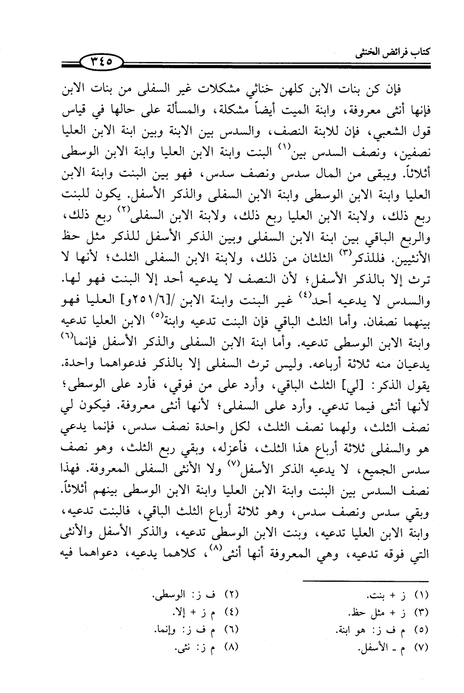 فإن كن بنات الابن كلهن خناثي مشكلات غير السفلى من بنات الابن فإنها أنثى معروفة، وابنة الميت أيضاً مشكلة، والمسألة على حالها في قياس قول الشعبي، فإن للابنة النصف، والسدس بين الابنة وبين ابنة الابن العليا نصفين، ونصف السدس بين (¬1) البنت وابنة الابن العليا وابنة الابن الوسطى أثلاثاً. ويبقى من المال سدس ونصف سدس، فهو بين البنت وابنة الابن العليا وابنة الابن الوسطى وابنة الابن السفلى والذكر الأسفل. يكون للبنت ربع ذلك، ولابنة الابن العليا ربع ذلك، ولابنة الابن السفلى (¬2) ربع ذلك، والربع الباقي بين ابنة الابن السفلى وبين الذكر الأسفل للذكر مثل حظ الأنثيين. فللذكر (¬3) الثلثان من ذلك، ولابنة الابن السفلى الثلث؛ لأنها لا ترث إلا بالذكر الأسفل؛ لأن النصف لا يدعيه أحد إلا البنت فهو لها. والسدس لا يدعيه أحد (¬4) غير البنت وابنة الابن العليا فهو بينهما نصفان. وأما الثلث الباقي فإن البنت تدعيه وابنة (¬5) الابن العليا تدعيه وابنة الابن الوسطى تدعيه. وأما ابنة الابن السفلى والذكر الأسفل فإنما (¬6) يدعيان منه ثلاثة أرباعه. وليس ترث السفلى إلا بالذكر فدعواهما واحدة. يقول الذكر: [لي [الثلث الباقي، وأرد على من فوقي، فأرد على الوسطى؛ لأنها أنثى فيما تدعي. وأرد على السفلى؛ لأنها أنثى معروفة. فيكون لي نصف الثلث، ولهما نصف الثلث، لكل واحدة نصف سدس، فإنما يدعي هو والسفلى ثلاثة أرباع هذا الثلث، فأعزله، وبقي ربع الثلث، وهو نصف سدس الجميع، لا يدعيه الذكر الأسفل (¬7) ولا الأنثى السفلى المعروفة. فهذا نصف السدس بين البنت وابنة الابن العليا وابنة الابن الوسطى بينهم أثلاثاً. وبقي سدس ونصف سدس، وهو ثلاثة أرباع الثلث الباقي، فالبنت تدعيه، وابنة الابن العليا تدعيه، وبنت الابن الوسطى تدعيه، والذكر الأسفل والأنثى التي فوقه تدعيه، وهي المعروفة أنها أنثى (¬8)، كلاهما يدعيه، دعواهما فيه