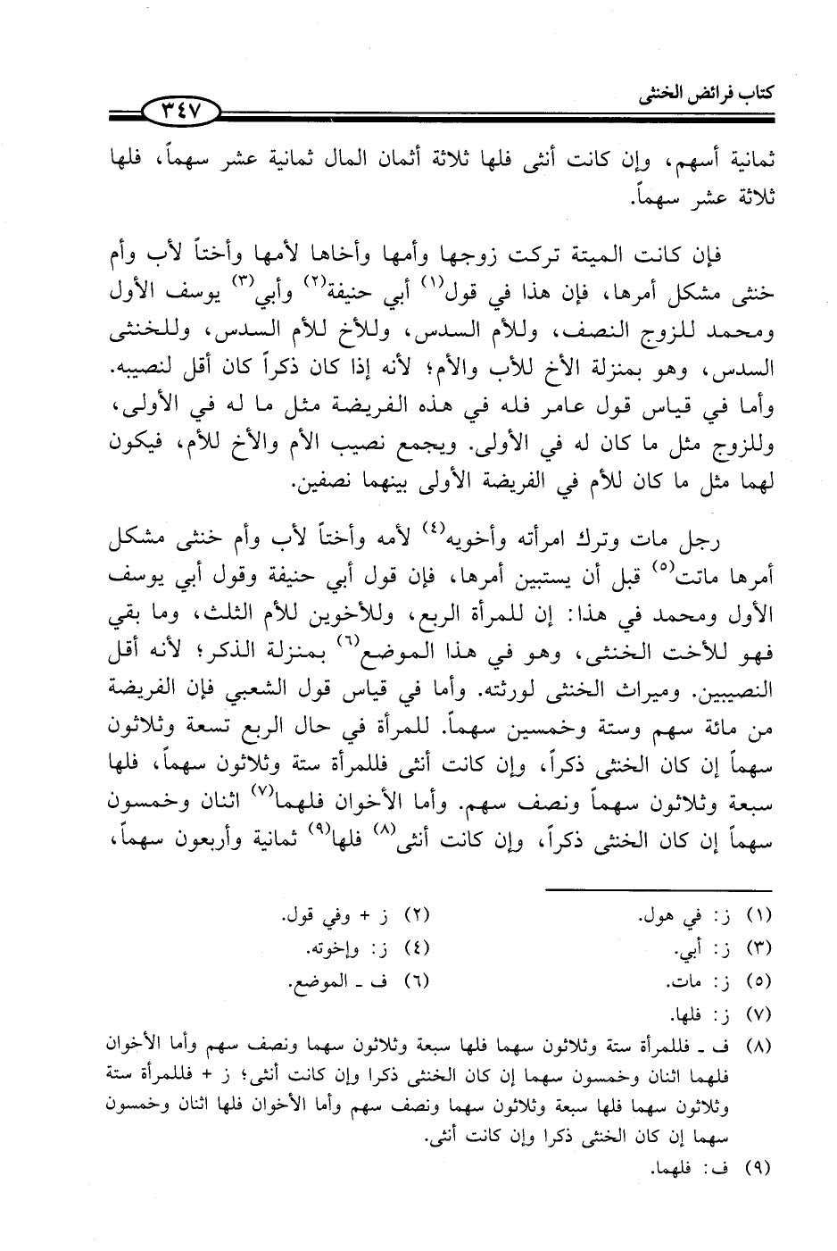 (¬8) ف - فللمرأة ستة وثلاثون سهما فلها سبعة وثلاثون سهما ونصف سهم وأما الأخوان فلهما اثنان وخمسون سهما إن كان الخنثى ذكرا وإن كانت أنثى؛ ز + فللمرأة ستة وثلاثون سهما فلها سبعة وثلاثون سهما ونصف سهم وأما الأخوان فلها اثنان وخمسون سهما إن كان الخنثى ذكرا وإن كانت أنثى.