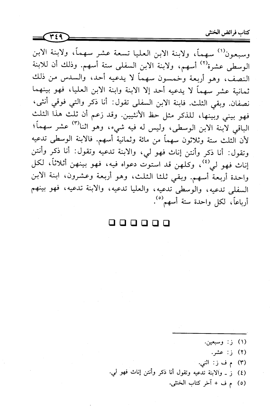 وسبعون (¬1) سهماً، ولابنة الابن العليا تسعة عشر سهماً، ولابنة الابن الوسطى عشرة (¬2) أسهم، ولابنة الابن السفلى ستة أسهم. وذلك أن للابنة النصف، وهو أربعة وخمسون سهماً لا يدعيه أحد، والسدس من ذلك ثمانية عشر سهماً لا يدعيه أحد إلا الابنة وابنة الابن العليا، فهو بينهما نصفان. وبقي الثلث. فابنة الابن السفلى تقول: أنا ذكر والتي فوقي أنثى، فهو بيني وبينها، للذكر مثل حظ الأنثيين. وقد زعم أن ثلث هذا الثلث الباقي لابنة الابن الوسطى، وليس له فيه شيء، وهو اثنا (¬3) عشر سهماً؛ لأن الثلث ستة وثلاثون سهماً من مائة وثمانية أسهم. فالابنة الوسطى تدعيه وتقول: أنا ذكر وأنتن إناث فهو لي، والابنة تدعيه وتقول: أنا ذكر وأنتن إناث فهو لي (¬4)، وكلهن قد استوت دعواه فيه، فهو بينهن أثلاثاً، لكل واحدة أربعة أسهم. وبقي ثلثا الثلث، وهو أربعة وعشرون، ابنة الابن السفلى تدعيه، والوسطى تدعيه، والعليا تدعيه، والابنة تدعيه، فهو بينهم أرباعاً، لكل واحدة ستة أسهم (¬5).