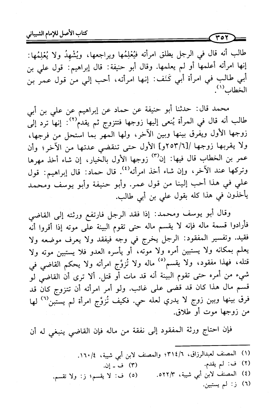 محمد قال: حدثنا أبو حنيفة عن حماد عن إبراهيم عن علي بن أبي طالب أنه قال في المرأة يُنعى إليها زوجها فتتزوج ثم يقدم (¬2): إنها ترد إلى زوجها الأول ويفرق بينها وبين الآخر، ولها المهر بما استحل من فرجها، ولا يقربها زوجها الأول حتى تنقضي عدتها من الآخر؛ وأن عمر بن الخطاب قال فيها: إن (¬3) زوجها الأول بالخيار، إن شاء أخذ مهرها وتركها عند الآخر، وإن شاء أخذ امرأته (¬4). قال حماد: قال إبراهيم: قول علي في هذا أحب إلينا من قول عمر. وأبو حنيفة وأبو يوسف ومحمد يأخذون في هذا كله بقول علي بن أبي طالب.