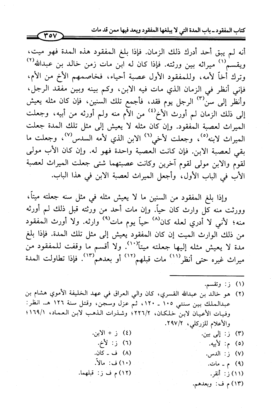 (¬2) هو خالد بن عبد الله القسري، كان والي العراق في عهد الخليفة الأموي هشام بن عبدالملك بين سنتي 105 - 120، ثم عزل وسجن، وقتل سنة 126 هـ انظر: وفيات الأعيان لابن خلكان، 2/ 226؛ وشذرات الذهب لابن العماد، 1/ 169؛ والأعلام للزركلي، 2/ 297.