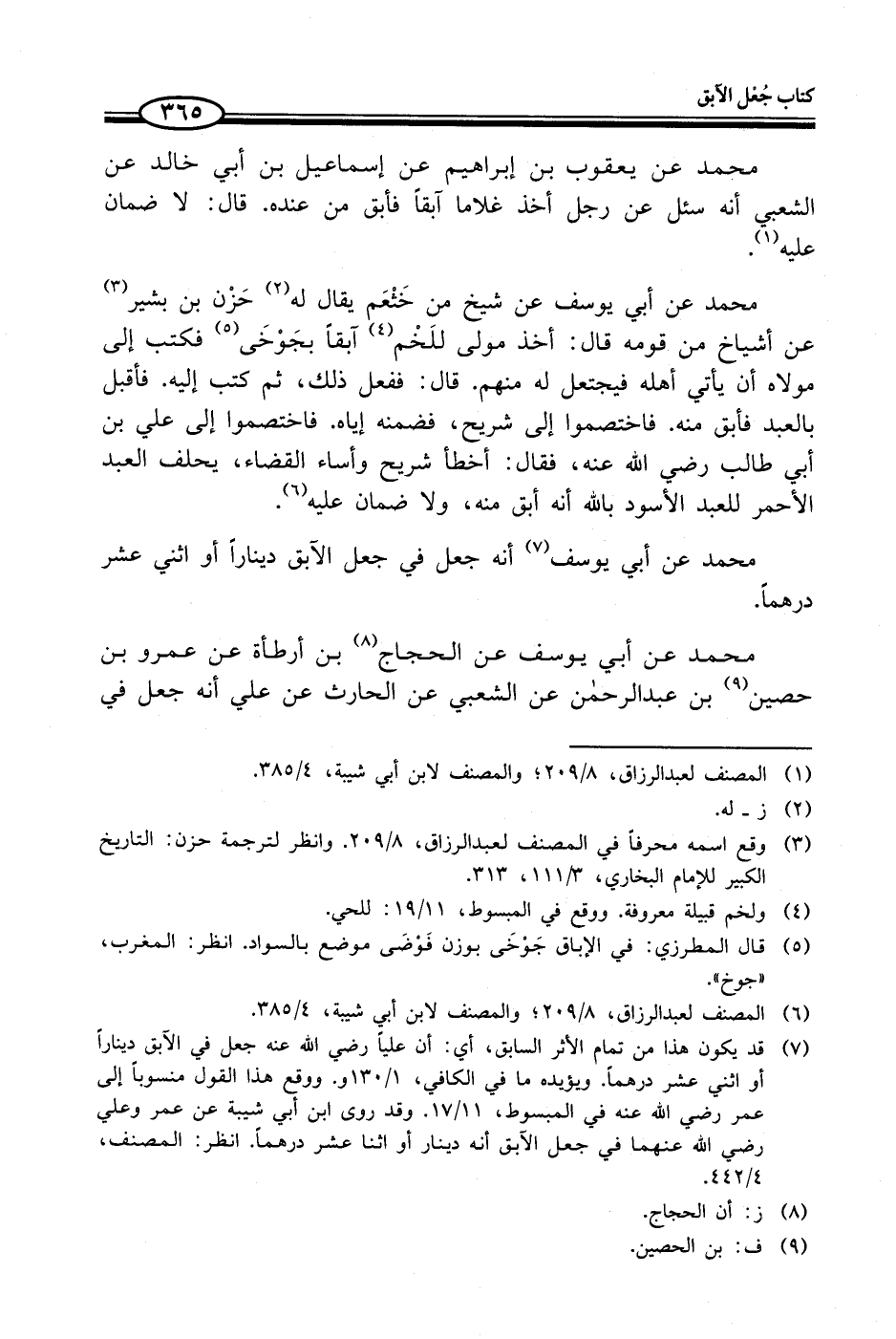 محمد عن أبي يوسف عن شيخ من خَثْعَم يقال له (¬2) حَزْن بن بشير (¬3) عن أشياخ من قومه قال: أخذ مولى للَخْم (¬4) آبقاً بجَوْخَى (¬5) فكتب إلى مولاه أن يأتي أهله فيجتعل له منهم. قال: ففعل ذلك، ثم كتب إليه. فأقبل بالعبد فأبق منه. فاختصموا إلى شريح، فضمنه إياه. فاختصموا إلى علي بن أبي طالب - رضي الله عنه -، فقال: أخطأ شريح وأساء القضاء، يحلف العبد الأحمر للعبد الأسود بالله أنه أبق منه، ولا ضمان عليه (¬6).
