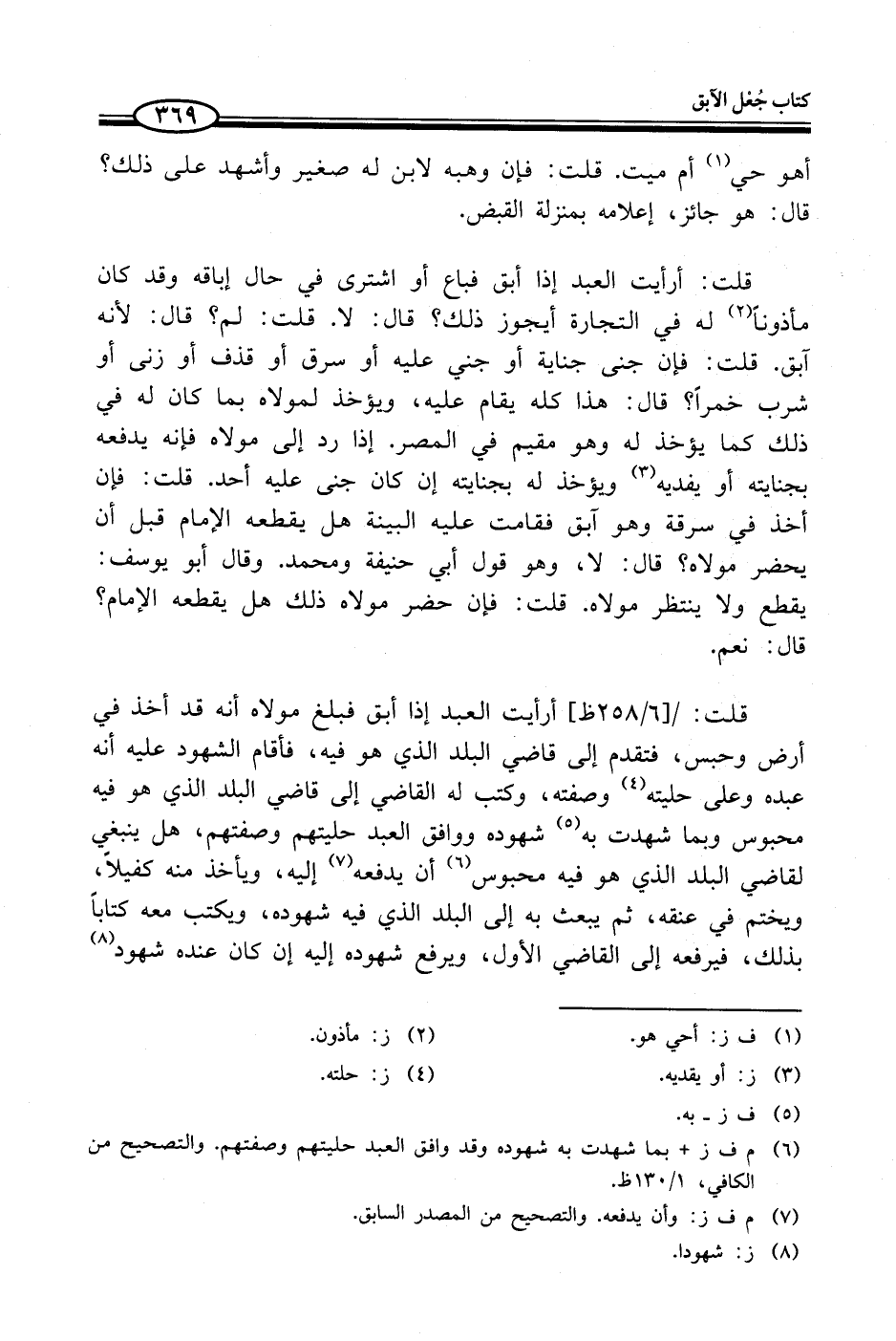 قلت: أرأيت العبد إذا أبق فباع أو اشترى في حال إباقه وقد كان مأذوناً (¬2) له في التجارة أيجوز ذلك؟ قال: لا. قلت: لم؟ قال: لأنه آبق. قلت: فإن جنى جناية أو جني عليه أو سرق أو قذف أو زنى أو شرب خمراً؟ قال: هذا كله يقام عليه، ويؤخذ لمولاه بما كان له في ذلك كما يؤخذ له وهو مقيم في المصر. إذا رد إلى مولاه فإنه يدفعه بجنايته أو يفديه (¬3) ويؤخذ له بجنايته إن كان جنى عليه أحد. قلت: فإن أخذ في سرقة وهو آبق فقامت عليه البينة هل يقطعه الإمام قبل أن يحضر مولاه؟ قال: لا، وهو قول أبي حنيفة ومحمد. وقال أبو يوسف: يقطع ولا ينتظر مولاه. قلت: فإن حضر مولاه ذلك هل يقطعه الإمام؟ قال: نعم.