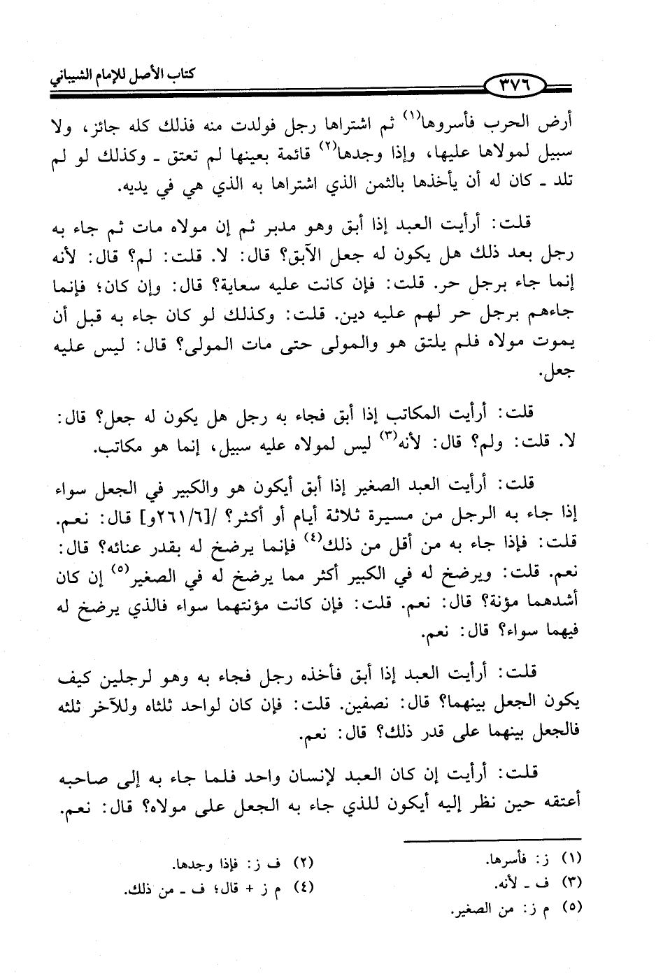 قلت: أرأيت العبد إذا أبق فأخذه رجل فجاء به وهو لرجلين كيف يكون الجعل بينهما؟ قال: نصفين. قلت: فإن كان لواحد ثلثاه وللآخر ثلثه فالجعل بينهما على قدر ذلك؟ قال: نعم.