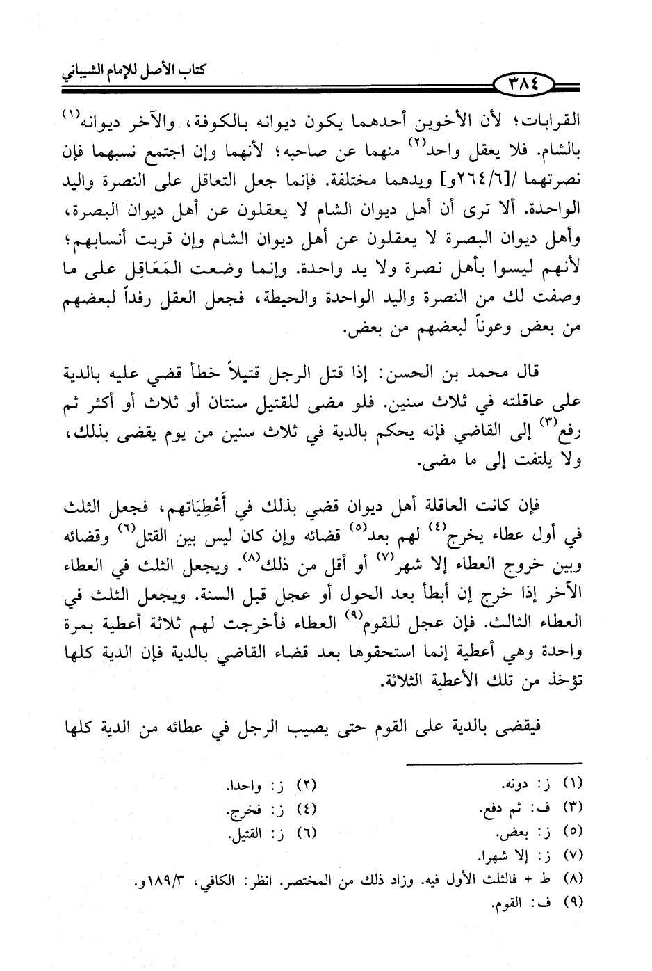 قال محمد بن الحسن: إذا قتل الرجل قتيلاً خطأ قضي عليه بالدية على عاقلته في ثلاث سنين. فلو مضى للقتيل سنتان أو ثلاث أو أكثر ثم رفع (¬3) إلى القاضي فإنه يحكم بالدية في ثلاث سنين من يوم يقضى بذلك، ولا يلتفت إلى ما مضى.